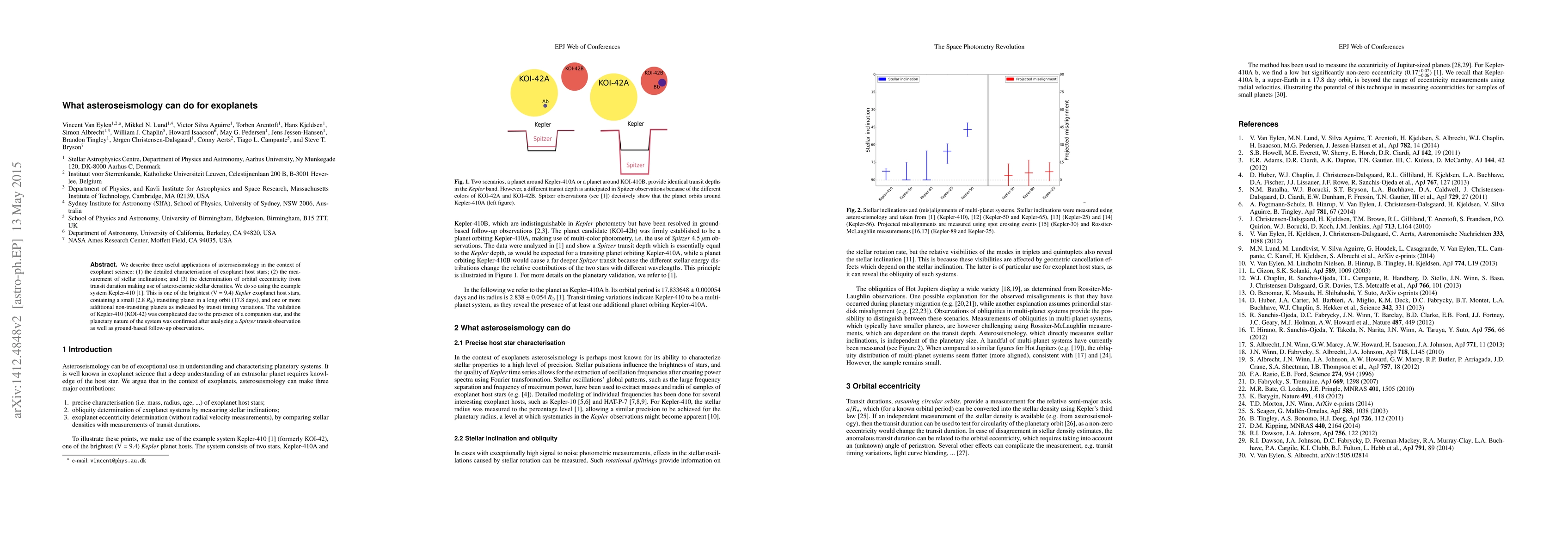 We describe three useful applications of asteroseismology in the context of exoplanet science: (1) the detailed characterisation of exoplanet host stars; (2) the measurement of stellar inclinations; and (3) the determination of orbital eccentricity from transit duration making use of asteroseismic stellar densities. We do so using the example system Kepler-410 (Van Eylen et al. 2014). This is one of the brightest (V = 9.4) Kepler exoplanet host stars, containing a small (2.8 Rearth) transiting planet in a long orbit (17.8 days), and one or more additional non-transiting planets as indicated by transit timing variations. The validation of Kepler-410 (KOI-42) was complicated due to the presence of a companion star, and the planetary nature of the system was confirmed after analyzing a Spitzer transit observation as well as ground-based follow-up observations.