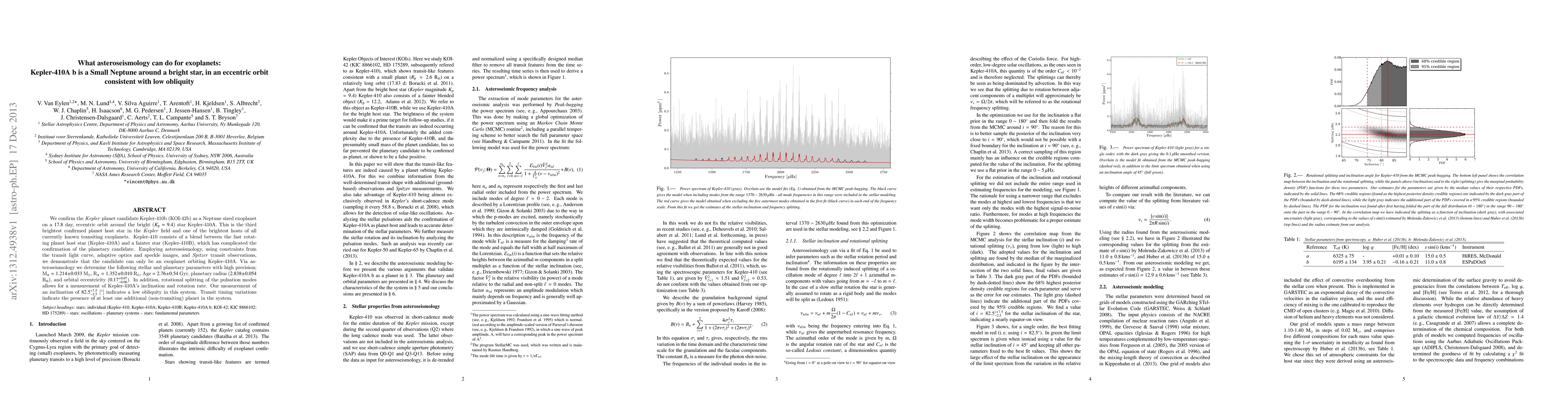 We confirm the Kepler planet candidate Kepler-410b (KOI-42b) as a Neptune sized exoplanet on a 17.8 day, eccentric orbit around the bright (Kp = 9.4) star Kepler-410A. This is the third brightest confirmed planet host star in the Kepler field and one of the brightest hosts of all currently known transiting exoplanets. Kepler-410 consists of a blend between the fast rotating planet host star (Kepler-410A) and a fainter star (Kepler-410B), which has complicated the confirmation of the planetary candidate. Employing asteroseismology, using constraints from the transit light curve, adaptive optics and speckle images, and Spitzer transit observations, we demonstrate that the candidate can only be an exoplanet orbiting Kepler-410A. Via asteroseismology we determine the following stellar and planetary parameters with high precision; M$_\star = 1.214 \pm 0.033$ M$_\odot$, R$_\star = 1.352 \pm 0.010$ R$_\odot$, Age = $2.76 \pm 0.54$ Gyr, planetary radius ($2.838 \pm 0.054$ R$_\oplus$), and orbital eccentricity ($0.17^{+0.07}_{-0.06}$). In addition, rotational splitting of the pulsation modes allows for a measurement of Kepler-410A's inclination and rotation rate. Our measurement of an inclination of $82.5^{+7.5}_{-2.5}$ [$^\circ$] indicates a low obliquity in this system. Transit timing variations indicate the presence of at least one additional (non-transiting) planet in the system.