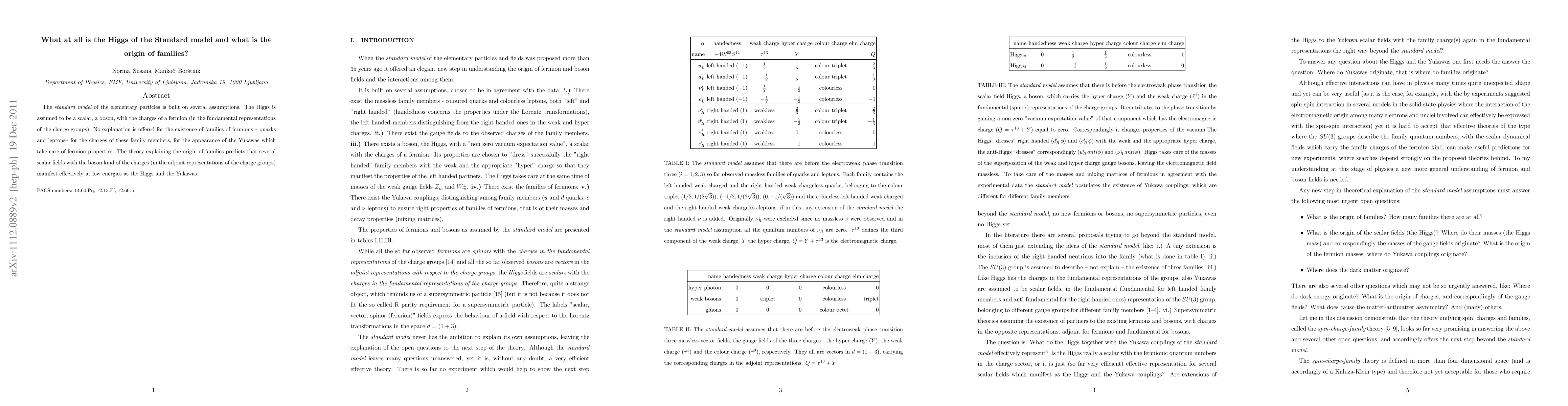 The standard model of the elementary particles is built on several assumptions. The Higgs is assumed to be a scalar, a boson, with the charges of a fermion (in the fundamental representations of the charge groups). No explanation is offered for the existence of families of fermions -- quarks and leptons-- for the charges of these family members, for the appearance of the Yukawas which take care of fermion properties. The theory explaining the origin of families predicts that several scalar fields with the boson kind of the charges (in the adjoint representations of the charge groups) manifest effectively at low energies as the Higgs and the Yukawas.
