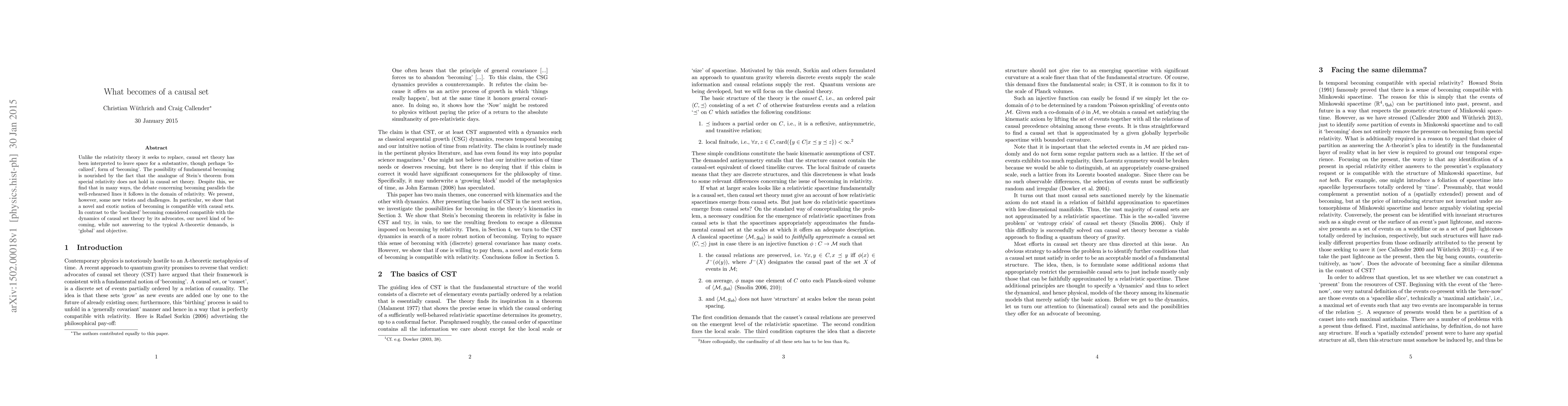 Unlike the relativity theory it seeks to replace, causal set theory has been interpreted to leave space for a substantive, though perhaps 'localized', form of 'becoming'. The possibility of fundamental becoming is nourished by the fact that the analogue of Stein's theorem from special relativity does not hold in causal set theory. Despite this, we find that in many ways, the debate concerning becoming parallels the well-rehearsed lines it follows in the domain of relativity. We present, however, some new twists and challenges. In particular, we show that a novel and exotic notion of becoming is compatible with causal sets. In contrast to the 'localized' becoming considered compatible with the dynamics of causal set theory by its advocates, our novel kind of becoming, while not answering to the typical A-theoretic demands, is 'global' and objective.