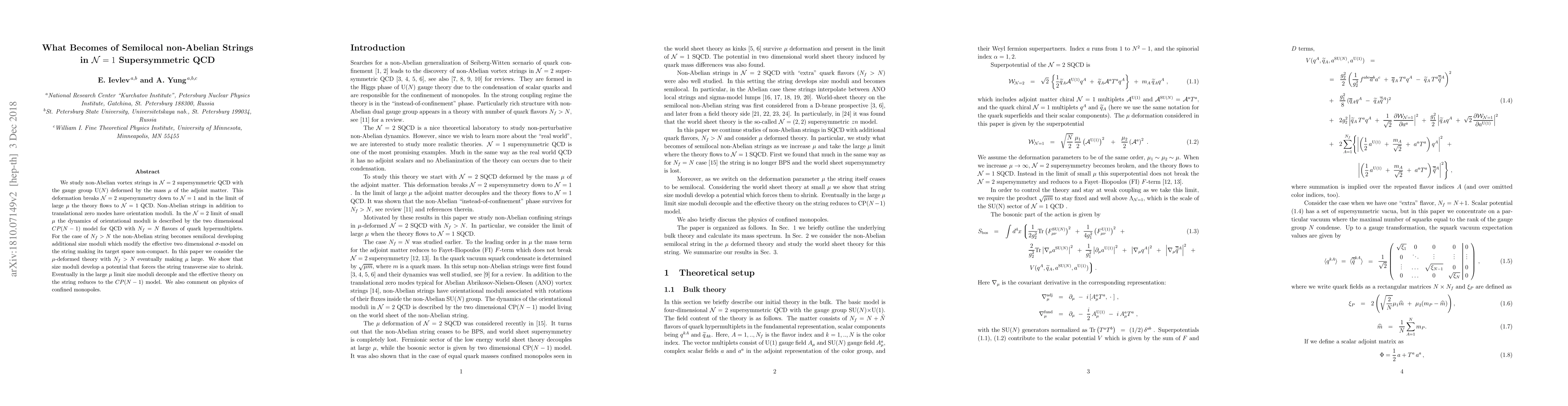 We study non-Abelian vortex strings in ${\mathcal N}=2$ supersymmetric QCD with the gauge group U$(N)$ deformed by the mass $\mu$ of the adjoint matter. This deformation breaks ${\mathcal N}=2$ supersymmetry down to ${\mathcal N}=1$ and in the limit of large $\mu$ the theory flows to ${\mathcal N}=1$ QCD. Non-Abelian strings in addition to translational zero modes have orientation moduli. In the ${\mathcal N}=2$ limit of small $\mu$ the dynamics of orientational moduli is described by the two dimensional $CP(N-1)$ model for QCD with $N_f=N$ flavors of quark hypermultiplets. For the case of $N_f>N$ the non-Abelian string becomes semilocal developing additional size moduli which modify the effective two dimensional $\sigma$-model on the string making its target space non-compact. In this paper we consider the $\mu$-deformed theory with $N_f>N$ eventually making $\mu$ large. We show that size moduli develop a potential that forces the string transverse size to shrink. Eventually in the large $\mu$ limit size moduli decouple and the effective theory on the string reduces to the $CP(N-1)$ model. We also comment on physics of confined monopoles.