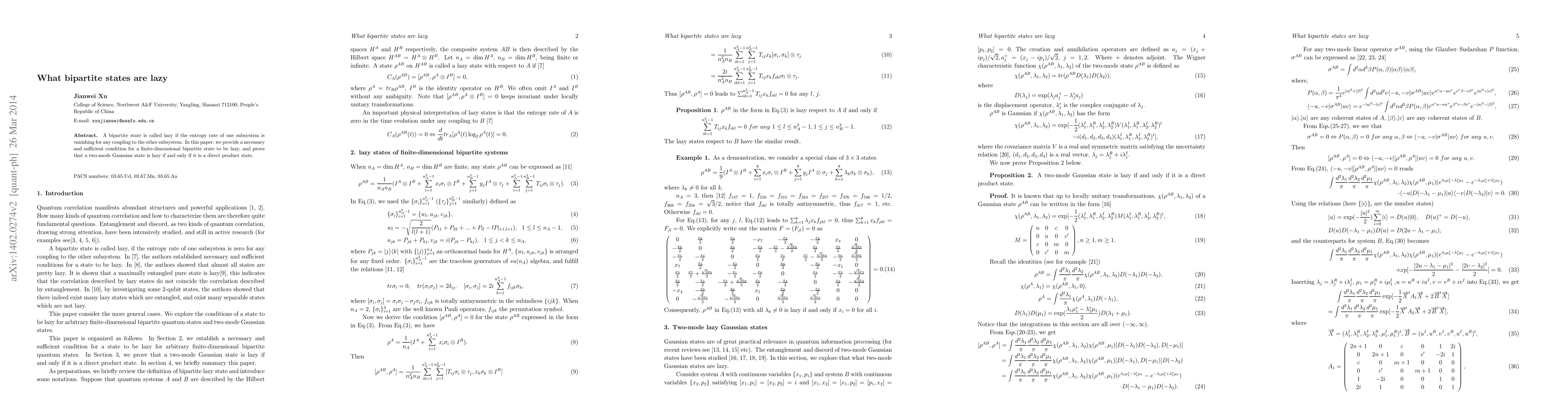 This paper establishes a necessary and sufficient condition for finite-dimensional bipartite states to be "lazy," where the entropy rate of one subsystem vanishes upon coupling. It proves that a two-mode Gaussian state is lazy if and only if it is a direct product state.