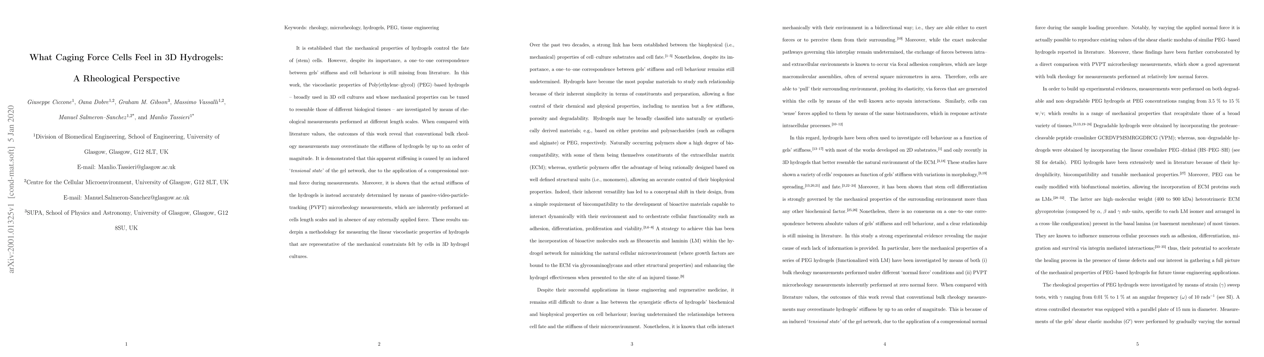 It is established that the mechanical properties of hydrogels control the fate of (stem) cells. However, despite its importance, a one-to-one correspondence between gels' stiffness and cell behaviour is still missing from literature. In this work, the viscoelastic properties of Poly(ethylene-glycol) (PEG)-based hydrogels - broadly used in 3D cell cultures and whose mechanical properties can be tuned to resemble those of different biological tissues - are investigated by means of rheological measurements performed at different length scales. When compared with literature values, the outcomes of this work reveal that conventional bulk rheology measurements may overestimate the stiffness of hydrogels by up to an order of magnitude. It is demonstrated that this apparent stiffening is caused by an induced 'tensional state' of the gel network, due to the application of a compressional normal force during measurements. Moreover, it is shown that the actual stiffness of the hydrogels is instead accurately determined by means of passive-video-particle-tracking (PVPT) microrheology measurements, which are inherently performed at cells length scales and in absence of any externally applied force. These results underpin a methodology for measuring the linear viscoelastic properties of hydrogels that are representative of the mechanical constraints felt by cells in 3D hydrogel cultures.