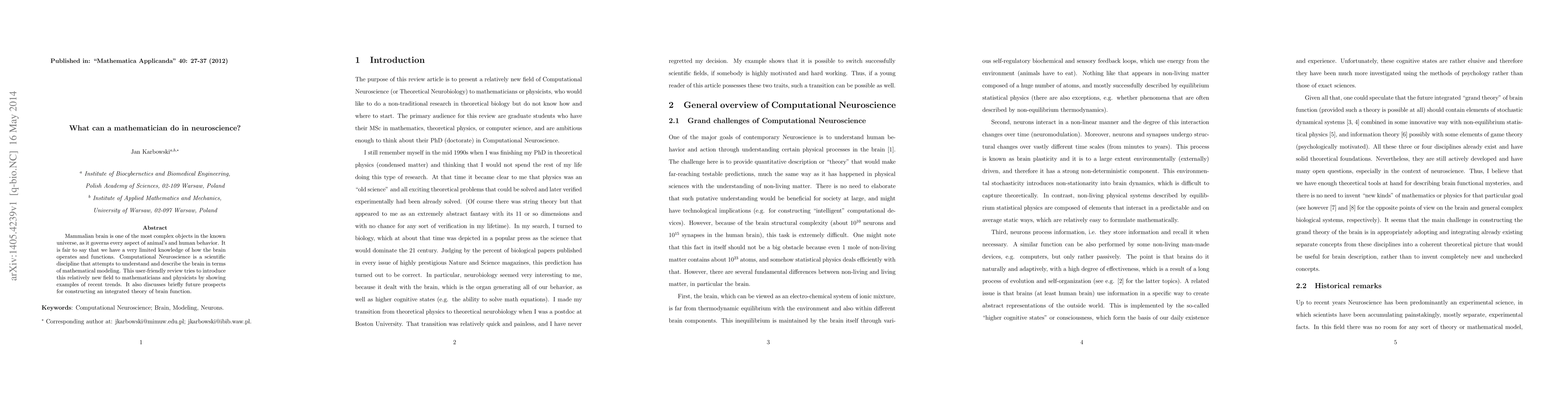 Mammalian brain is one of the most complex objects in the known universe, as it governs every aspect of animal's and human behavior. It is fair to say that we have a very limited knowledge of how the brain operates and functions. Computational Neuroscience is a scientific discipline that attempts to understand and describe the brain in terms of mathematical modeling. This user-friendly review tries to introduce this relatively new field to mathematicians and physicists by showing examples of recent trends. It also discusses briefly future prospects for constructing an integrated theory of brain function.