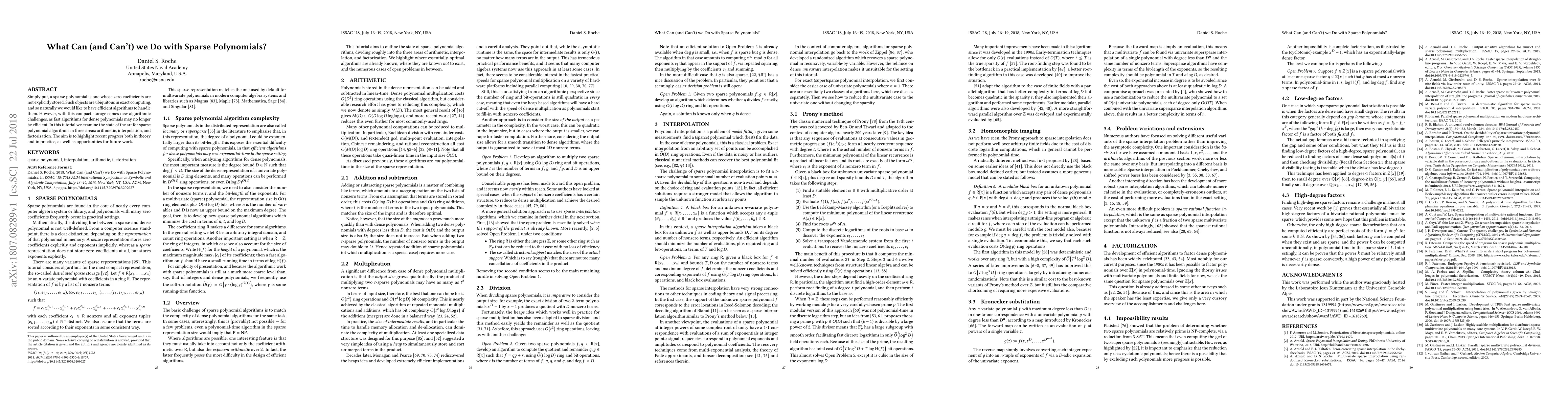 This tutorial examines recent progress in algorithms for sparse polynomials, highlighting efficient methods for arithmetic, interpolation, and factorization while overcoming challenges of compact storage.
