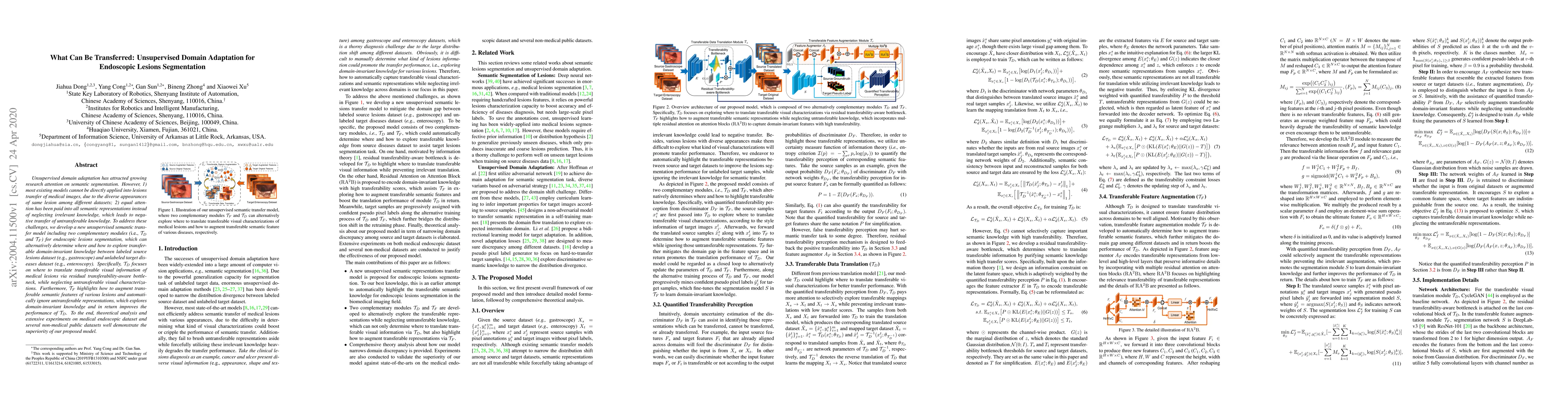 This paper proposes an unsupervised domain adaptation model for endoscopic lesions segmentation, addressing the challenges of diverse lesion appearances and irrelevant knowledge transfer. The model includes two modules, T_D and T_F, to identify and utilize transferable domain-invariant knowledge, thereby improving segmentation performance.