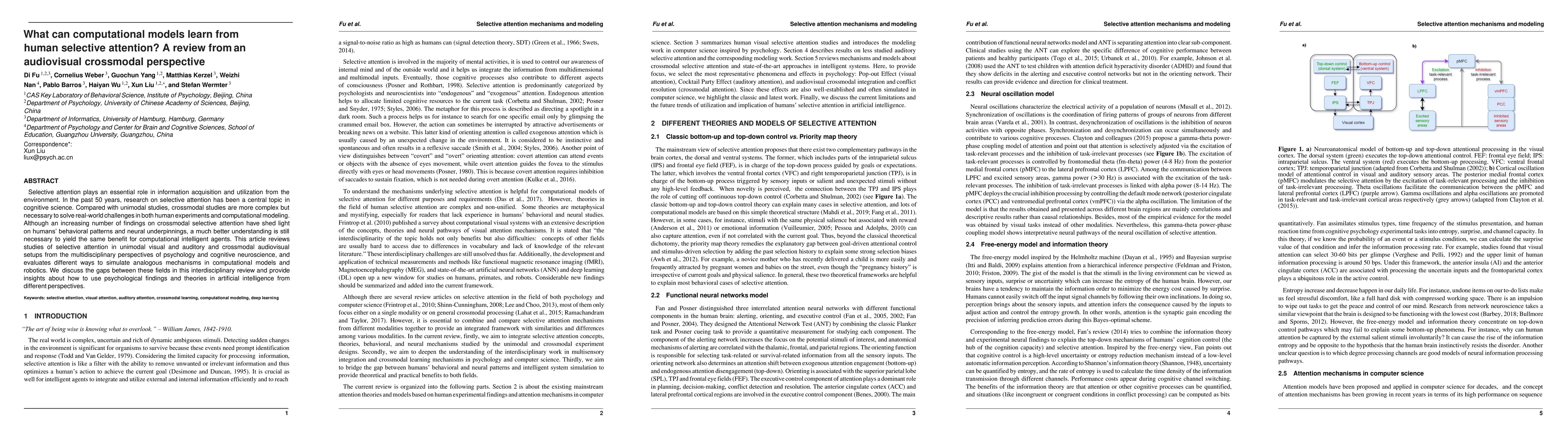 This review examines how computational models can learn from human selective attention in audiovisual crossmodal setups, aiming to improve artificial intelligence and robotics. It discusses key findings, gaps between fields, and provides insights on using psychological theories in AI.