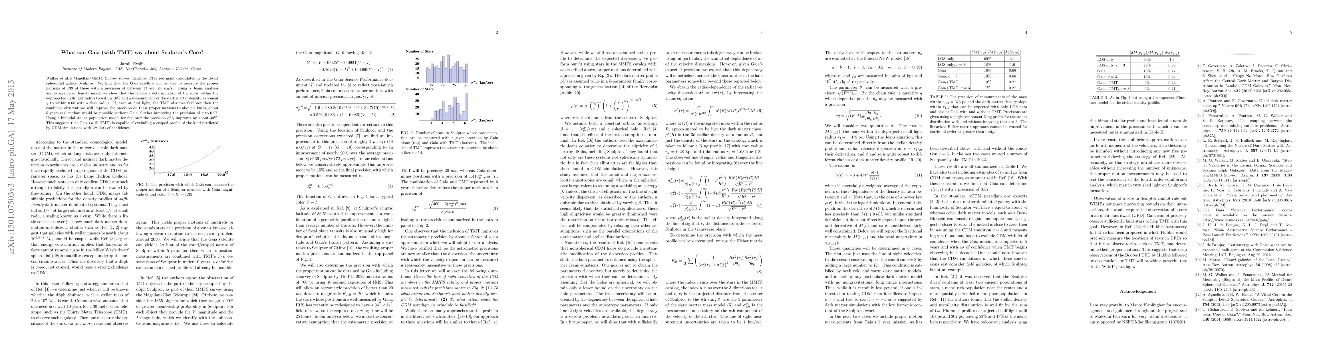 Walker et al.'s Magellan/MMFS Survey survey identified 1355 red giant candidates in the dwarf spheroidal galaxy Sculptor. We find that the Gaia satellite will be able to measure the proper motions of 139 of these with a precision of between 13 and 20 km/s. Using a Jeans analysis and 5-parameter density model we show that this allows a determination of the mass within the deprojected half-light radius to within 16% and a measurement of the dark matter density exponent gamma to within 0.68 within that radius. If, even at first light, the TMT observes Sculptor then the combined observations will improve the precision on these proper motions to about 5 km/s, about 5 years earlier than would be possible without Gaia, further improving the precision of gamma to 0.27. Using a bimodal stellar population model for Sculptor the precision of gamma improves by about 30%. This suggests that Gaia (with TMT) is capable of excluding a cored profile of the kind predicted by CDM simulations with 2 sigma (4 sigma) of confidence.