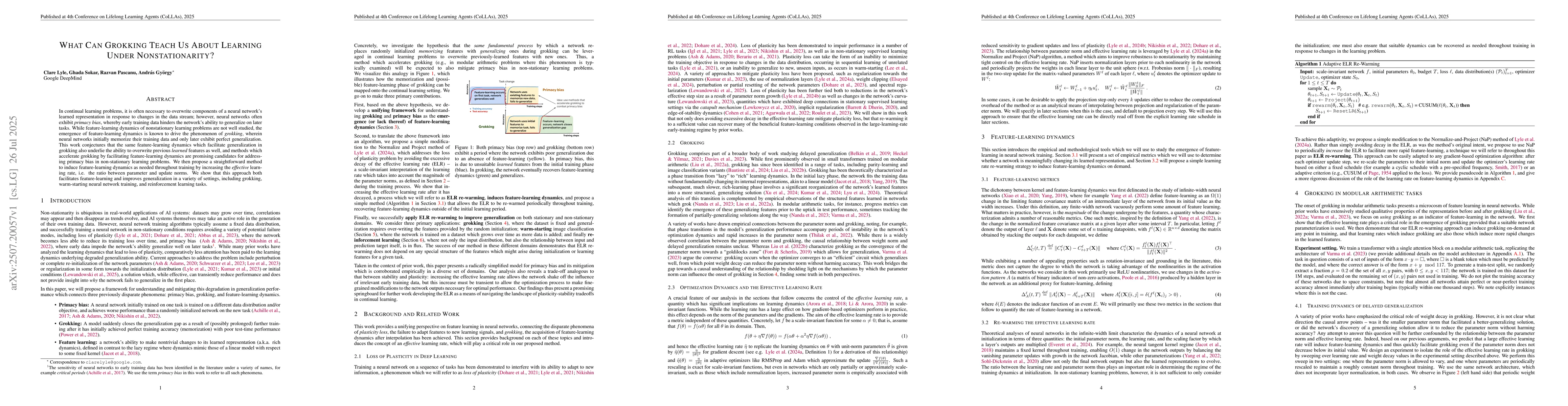 In continual learning problems, it is often necessary to overwrite components of a neural network's learned representation in response to changes in the data stream; however, neural networks often exhibit \primacy bias, whereby early training data hinders the network's ability to generalize on later tasks. While feature-learning dynamics of nonstationary learning problems are not well studied, the emergence of feature-learning dynamics is known to drive the phenomenon of grokking, wherein neural networks initially memorize their training data and only later exhibit perfect generalization. This work conjectures that the same feature-learning dynamics which facilitate generalization in grokking also underlie the ability to overwrite previous learned features as well, and methods which accelerate grokking by facilitating feature-learning dynamics are promising candidates for addressing primacy bias in non-stationary learning problems. We then propose a straightforward method to induce feature-learning dynamics as needed throughout training by increasing the effective learning rate, i.e. the ratio between parameter and update norms. We show that this approach both facilitates feature-learning and improves generalization in a variety of settings, including grokking, warm-starting neural network training, and reinforcement learning tasks.
