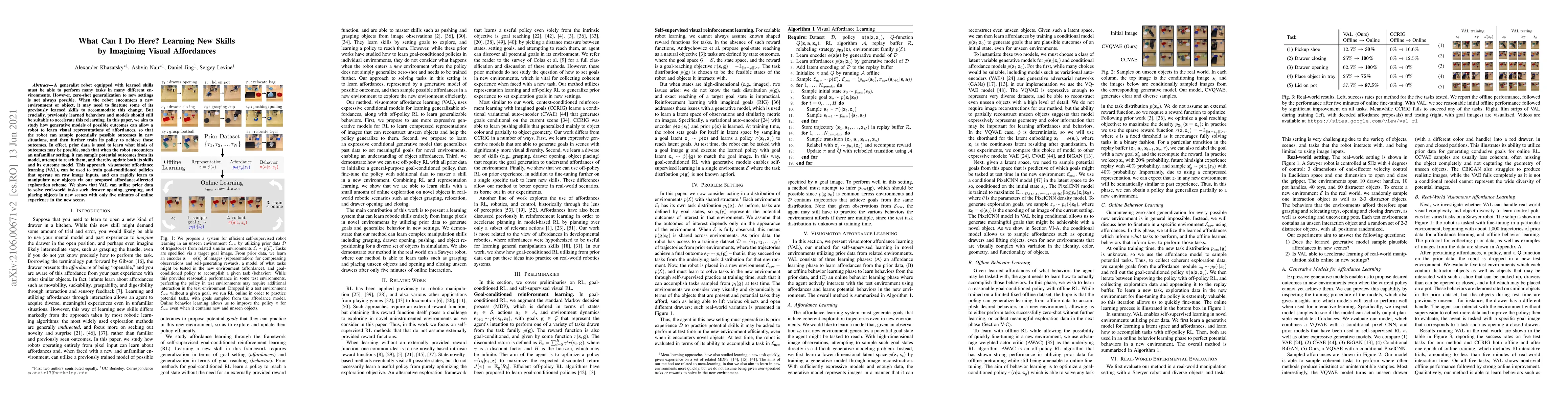 A new approach called visuomotor affordance learning (VAL) enables robots to learn visual representations of possible outcomes in new environments, allowing them to sample potential outcomes and update their skills rapidly, even with only 5 minutes of online experience.