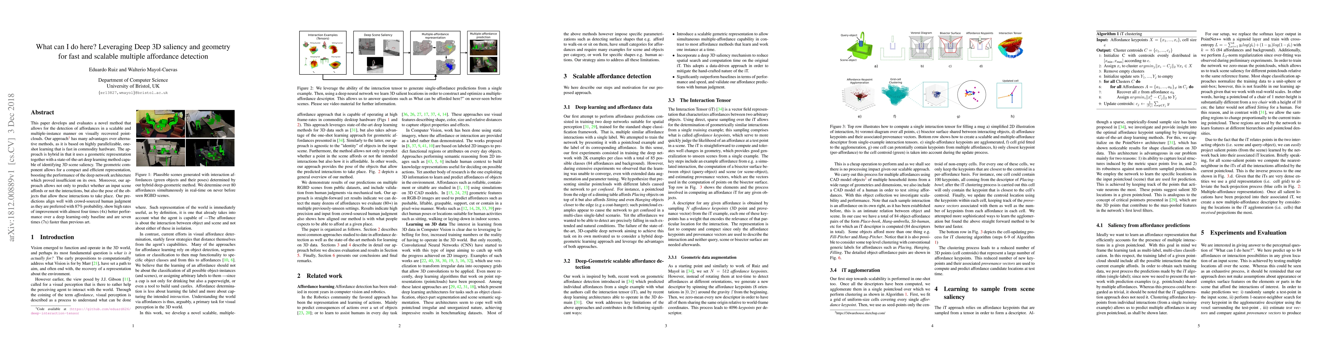 This paper develops and evaluates a novel method that allows for the detection of affordances in a scalable and multiple-instance manner on visually recovered pointclouds. Our approach has many advantages over alternative methods, as it is based on highly parallelizable, one-shot learning that is fast in commodity hardware. The approach is hybrid in that it uses a geometric representation together with a state-of-the-art deep learning method capable of identifying 3D scene saliency. The geometric component allows for a compact and efficient representation, boosting the performance of the deep network architecture which proved insufficient on its own. Moreover, our approach allows not only to predict whether an input scene affords or not the interactions, but also the pose of the objects that allow these interactions to take place. Our predictions align well with crowd-sourced human judgment as they are preferred with 87% probability, show high rates of improvement with almost four times (4x) better performance over a deep learning-only baseline and are seven times (7x) faster than previous art.