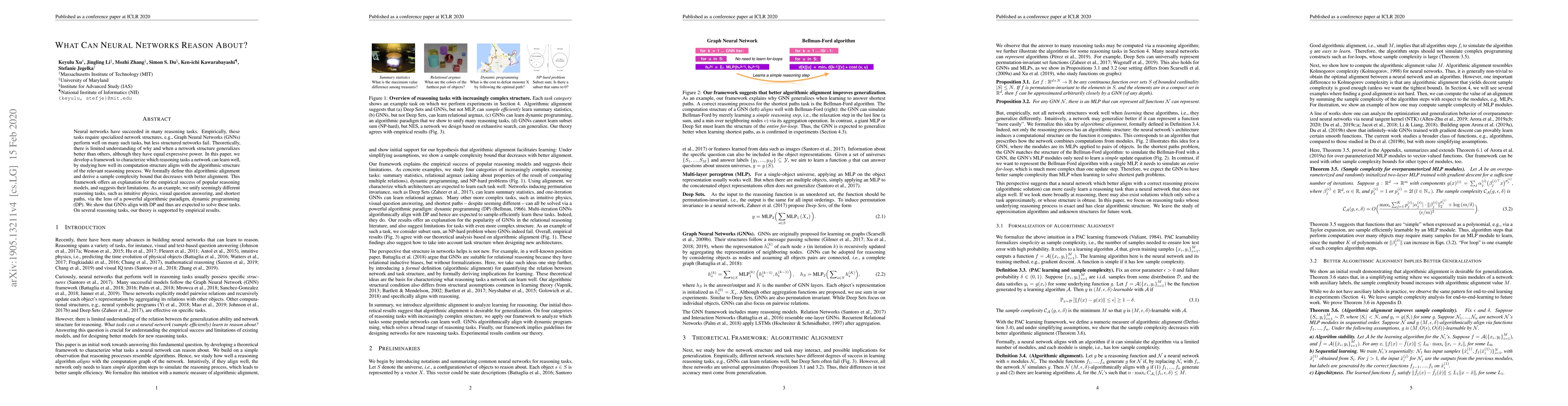 Neural networks have succeeded in many reasoning tasks. Empirically, these tasks require specialized network structures, e.g., Graph Neural Networks (GNNs) perform well on many such tasks, but less structured networks fail. Theoretically, there is limited understanding of why and when a network structure generalizes better than others, although they have equal expressive power. In this paper, we develop a framework to characterize which reasoning tasks a network can learn well, by studying how well its computation structure aligns with the algorithmic structure of the relevant reasoning process. We formally define this algorithmic alignment and derive a sample complexity bound that decreases with better alignment. This framework offers an explanation for the empirical success of popular reasoning models, and suggests their limitations. As an example, we unify seemingly different reasoning tasks, such as intuitive physics, visual question answering, and shortest paths, via the lens of a powerful algorithmic paradigm, dynamic programming (DP). We show that GNNs align with DP and thus are expected to solve these tasks. On several reasoning tasks, our theory is supported by empirical results.