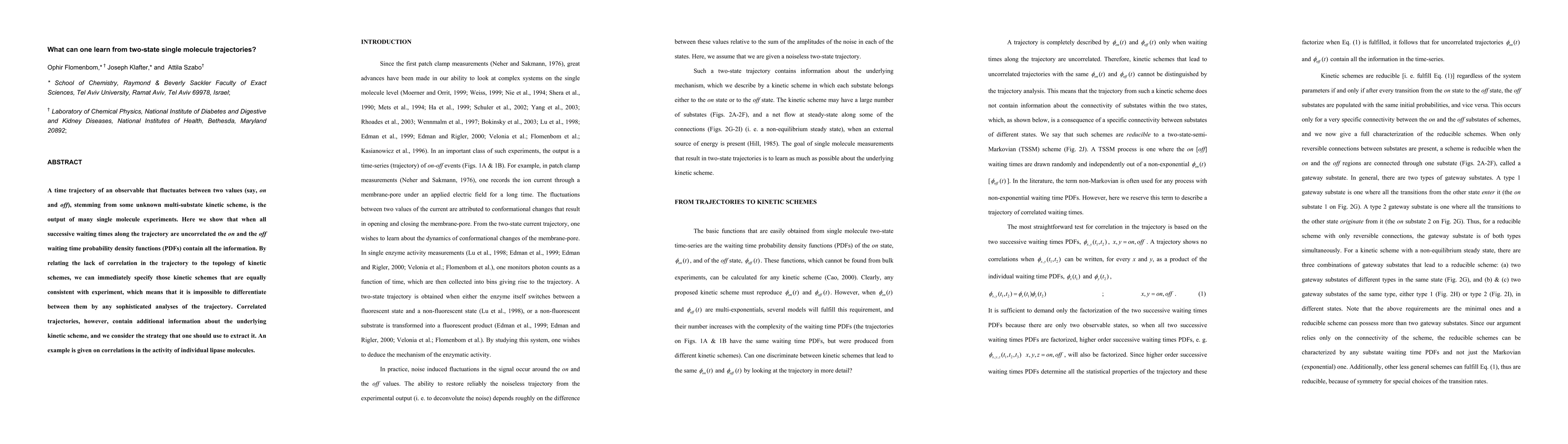 A time trajectory of an observable that fluctuates between two values (say, on and off), stemming from some unknown multi-substate kinetic scheme, is the output of many single molecule experiments. Here we show that when all successive waiting times along the trajectory are uncorrelated the on and the off waiting time probability density functions (PDFs) contain all the information. By relating the lack of correlation in the trajectory to the topology of kinetic schemes, we can immediately specify those kinetic schemes that are equally consistent with experiment, which means that it is impossible to differentiate between them by any sophisticated analyses of the trajectory. Correlated trajectories, however, contain additional information about the underlying kinetic scheme, and we consider the strategy that one should use to extract it. An example is given on correlations in the activity of individual lipase molecules.