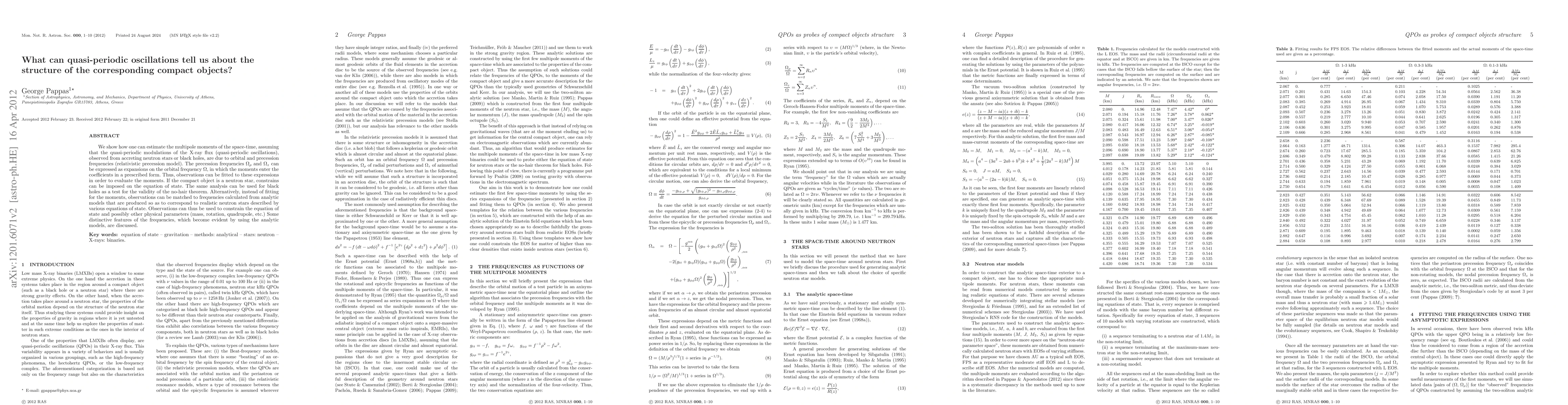 This paper demonstrates how quasi-periodic oscillations in X-ray flux from accreting neutron stars or black holes can be used to estimate the multipole moments of their space-time, providing insights into the structure of these compact objects and testing the no-hair theorem for black holes. The analysis can also constrain the neutron star's equation of state and reveal physical parameters like mass and rotation.