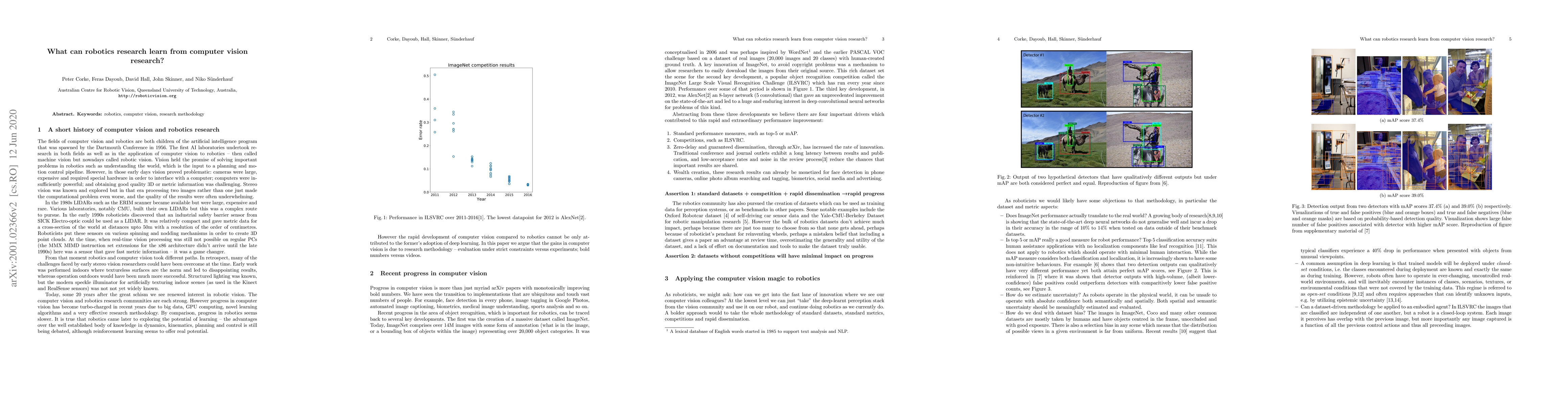 This paper explores how robotics research can benefit from the effective research methodology of computer vision, which has seen rapid advancements due to rigorous evaluation practices and the use of large datasets, GPU computing, and novel learning algorithms. The slower progress in robotics is attributed to less stringent evaluation and experimentation compared to computer vision.