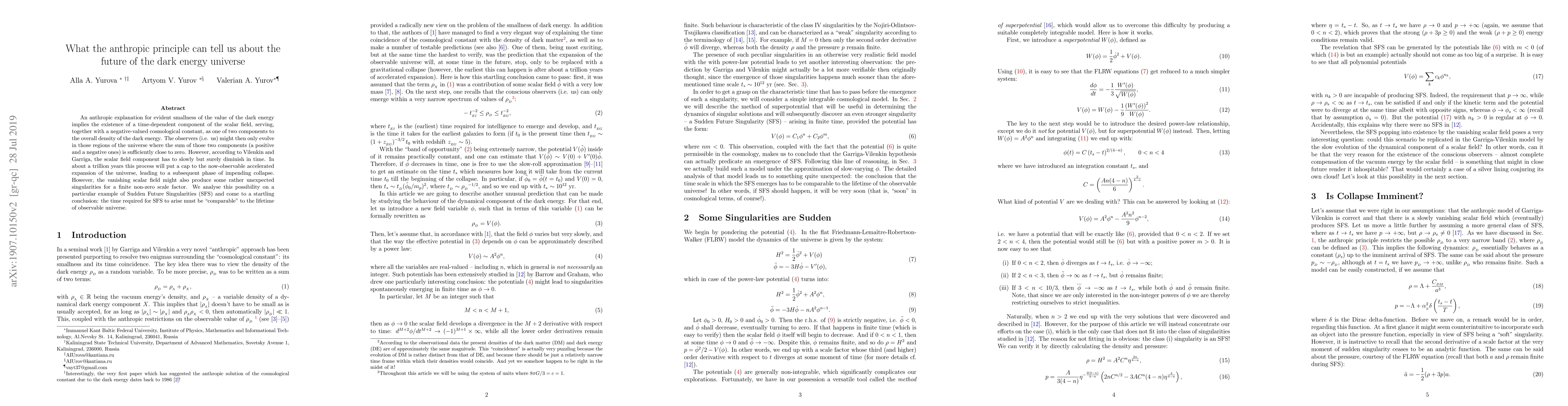 An anthropic explanation for evident smallness of the value of the dark energy implies the existence of a time-dependent component of the scalar field, serving, together with a negative-valued cosmological constant, as one of two components to the overall density of the dark energy. The observers (i.e. us) might then only evolve in those regions of the universe where the sum of those two components (a positive and a negative ones) is sufficiently close to zero. However, according to Vilenkin and Garriga, the scalar field component has to slowly but surely diminish in time. In about a trillion years this process will put a cap to the now-observable accelerated expansion of the universe, leading to a subsequent phase of impending collapse. However, the vanishing scalar field might also produce some rather unexpected singularities for a finite non-zero scale factor. We analyse this possibility on a particular example of Sudden Future Singularities (SFS) and come to a startling conclusion: the time required for SFS to arise must be "comparable" to the lifetime of observable universe.