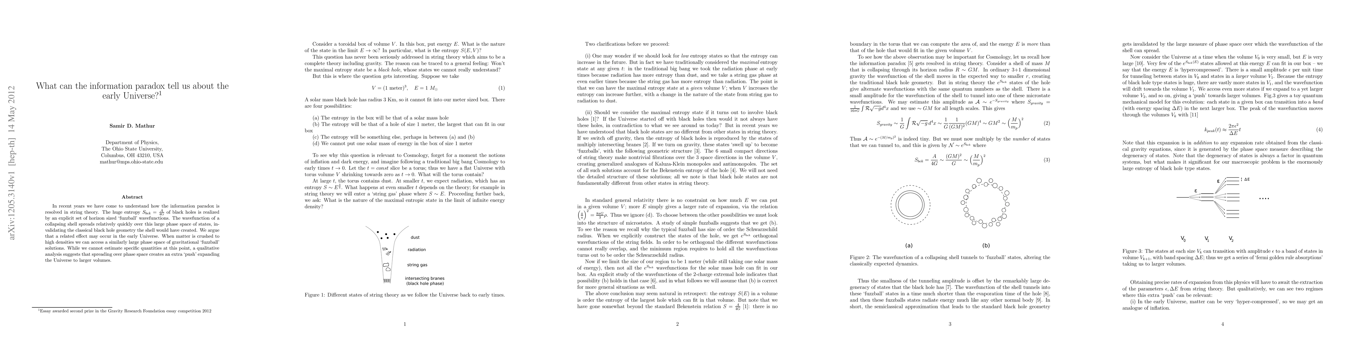 This paper explores how the resolution of the information paradox in string theory, through the concept of black hole fuzzballs, may provide insights into the dynamics of the early Universe. It suggests that high-density matter in the early Universe could similarly spread over a large phase space of gravitational fuzzball solutions, potentially generating an extra expansionary force that expands the Universe to larger volumes.