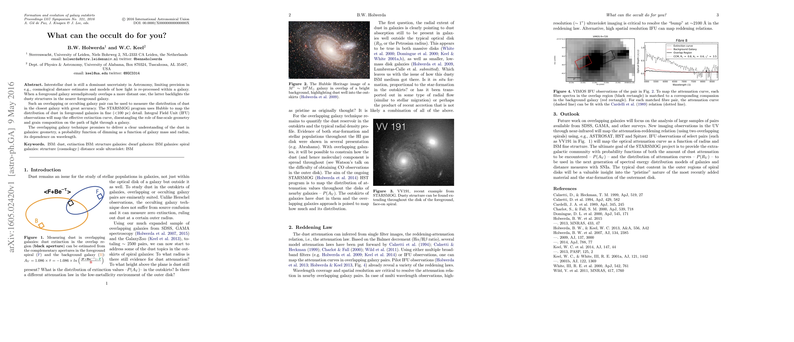 Interstellar dust is still a dominant uncertainty in Astronomy, limiting precision in e.g., cosmological distance estimates and models of how light is re-processed within a galaxy. When a foreground galaxy serendipitously overlaps a more distant one, the latter backlights the dusty structures in the nearer foreground galaxy. Such an overlapping or occulting galaxy pair can be used to measure the distribution of dust in the closest galaxy with great accuracy. The STARSMOG program uses Hubble to map the distribution of dust in foreground galaxies in fine (<100 pc) detail. Integral Field Unit (IFU) observations will map the effective extinction curve, disentangling the role of fine-scale geometry and grain composition on the path of light through a galaxy. The overlapping galaxy technique promises to deliver a clear understanding of the dust in galaxies: geometry, a probability function of dimming as a function of galaxy mass and radius, and its dependence on wavelength.