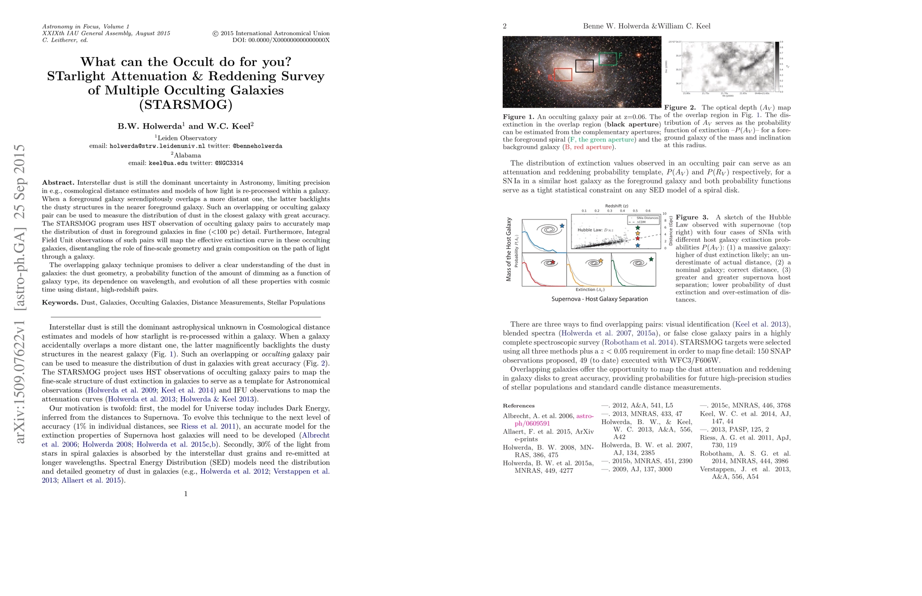 Interstellar dust is still the dominant uncertainty in Astronomy, limiting precision in e.g., cosmological distance estimates and models of how light is re-processed within a galaxy. When a foreground galaxy serendipitously overlaps a more distant one, the latter backlights the dusty structures in the nearer foreground galaxy. Such an overlapping or occulting galaxy pair can be used to measure the distribution of dust in the closest galaxy with great accuracy. The STARSMOG program uses HST observation of occulting galaxy pairs to accurately map the distribution of dust in foreground galaxies in fine ($<$100 pc) detail. Furthermore, Integral Field Unit observations of such pairs will map the effective extinction curve in these occulting galaxies, disentangling the role of fine-scale geometry and grain composition on the path of light through a galaxy. The overlapping galaxy technique promises to deliver a clear understanding of the dust in galaxies: the dust geometry, a probability function of the amount of dimming as a function of galaxy type, its dependence on wavelength, and evolution of all these properties with cosmic time using distant, high-redshift pairs.