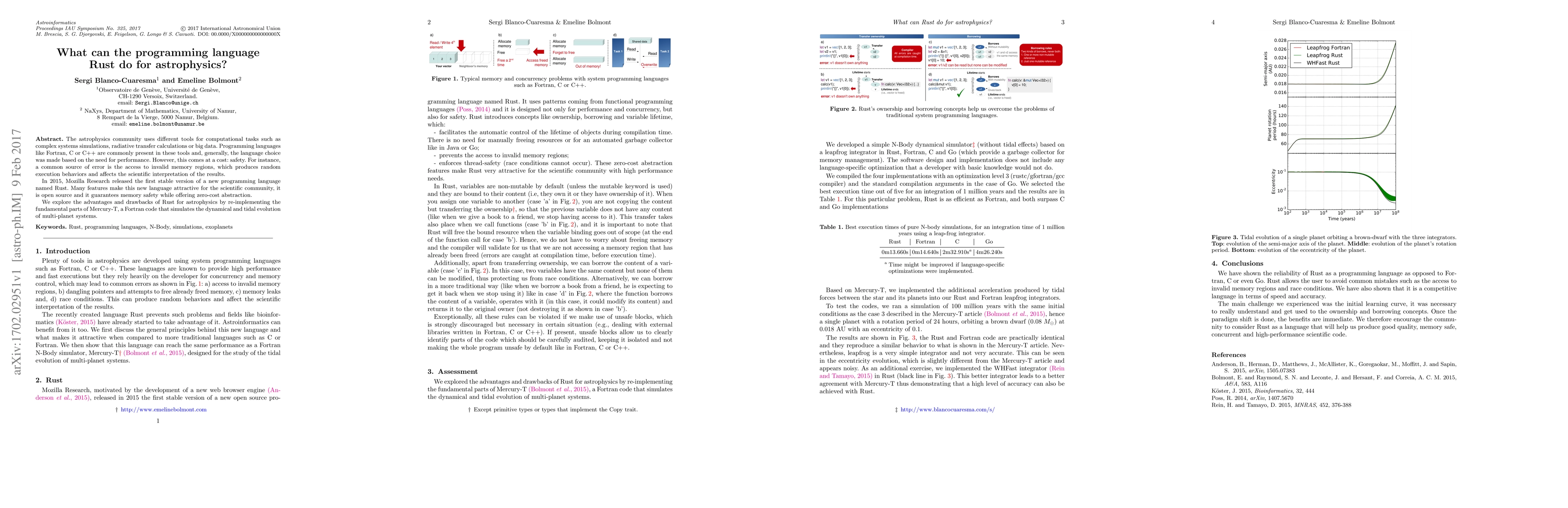 The astrophysics community uses different tools for computational tasks such as complex systems simulations, radiative transfer calculations or big data. Programming languages like Fortran, C or C++ are commonly present in these tools and, generally, the language choice was made based on the need for performance. However, this comes at a cost: safety. For instance, a common source of error is the access to invalid memory regions, which produces random execution behaviors and affects the scientific interpretation of the results. In 2015, Mozilla Research released the first stable version of a new programming language named Rust. Many features make this new language attractive for the scientific community, it is open source and it guarantees memory safety while offering zero-cost abstraction. We explore the advantages and drawbacks of Rust for astrophysics by re-implementing the fundamental parts of Mercury-T, a Fortran code that simulates the dynamical and tidal evolution of multi-planet systems.