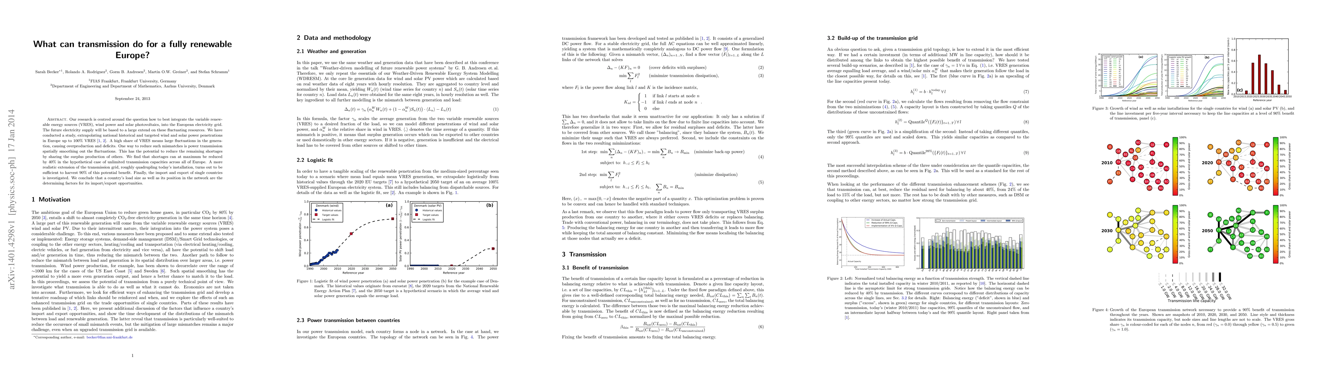 Our research is centred around the question how to best integrate the variable renewable energy sources (VRES), wind power and solar photovoltaics, into the European electricity grid. The future electricity supply will be based to a large extend on these fluctuating resources. We have conducted a study, extrapolating national historical and targeted wind and solar power penetrations in Europe up to 100% VRES (R.A. Rodriguez et al, Renewable Energy 63, p. 467, Mar 2014 and S. Becker et al, Energy 64, p. 404, Jan 2014). A high share of VRES means large fluctuations in the generation, causing overproduction and deficits. One way to reduce such mismatches is power transmission spatially smoothing out the fluctuations. This has the potential to reduce the remaining shortages by sharing the surplus production of others. We find that shortages can at maximum be reduced by 40% in the hypothetical case of unlimited transmission capacities across all of Europe. A more realistic extension of the transmission grid, roughly quadrupling today's installation, turns out to be sufficient to harvest 90% of this potential benefit. Finally, the import and export of single countries is investigated. We conclude that a country's load size as well as its position in the network are the determining factors for its import/export opportunities.