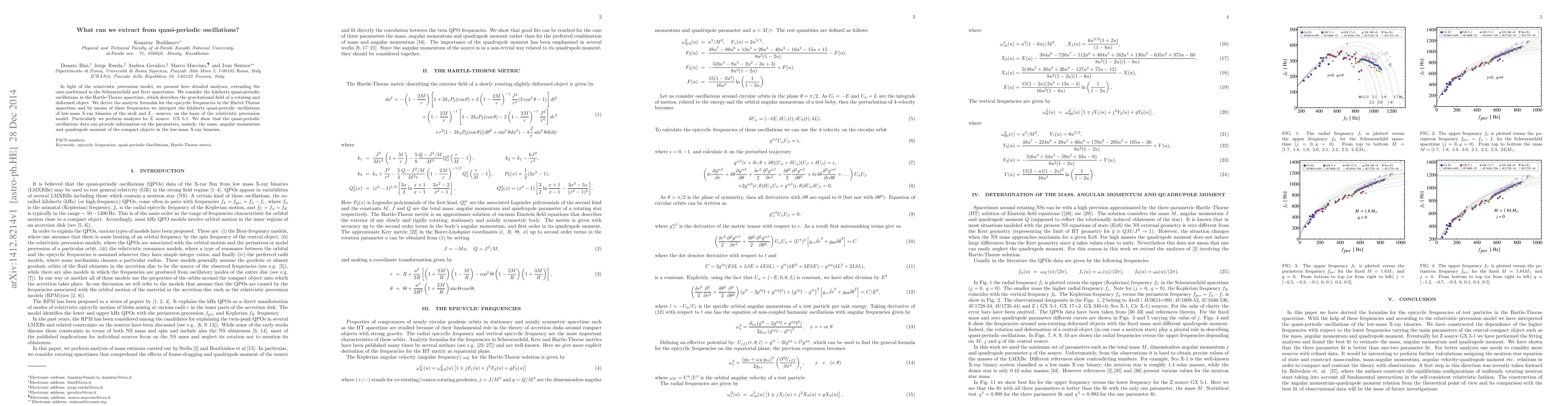 In light of the relativistic precession model, we present here detailed analyses, extending the ones performed in the Schwarzschild and Kerr spacetimes. We consider the kilohertz quasi-periodic oscillations in the Hartle-Thorne spacetime, which describes the gravitational field of a rotating and deformed object. We derive the analytic formulas for the epicyclic frequencies in the Hartel-Thorne spacetime and by means of these frequencies we interpret the kilohertz quasi-periodic oscillations of low-mass X-ray binaries of the atoll and Z - sources, on the basis of the relativistic precession model. Particularly we perform analyzes for Z -source: GX 5-1. We show that the quasi-periodic oscillations data can provide information on the parameters, namely, the mass, angular momentum and quadrupole moment of the compact objects in the low-mass X-ray binaries.