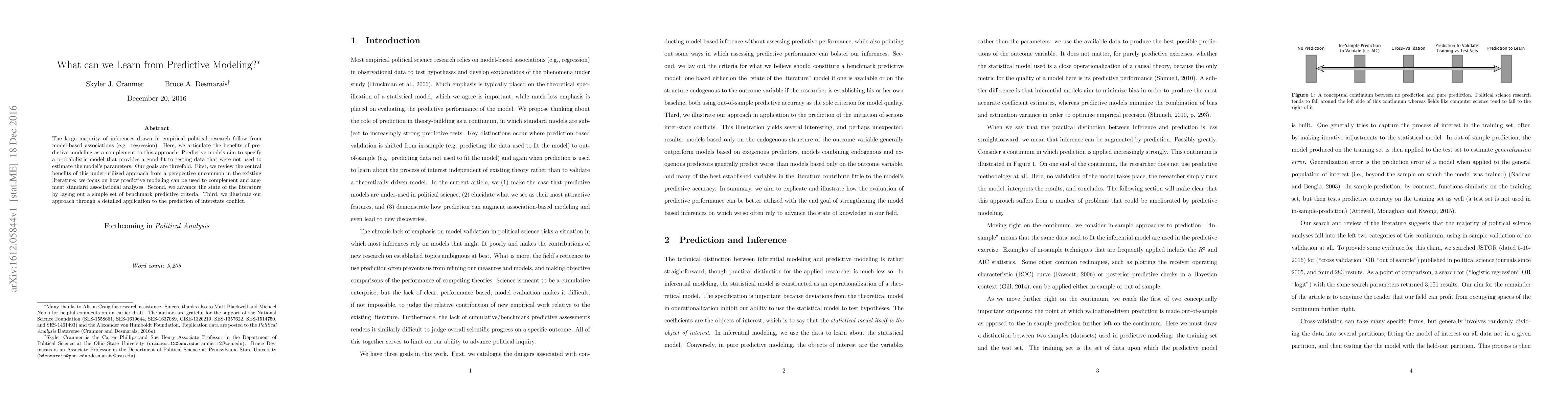 The large majority of inferences drawn in empirical political research follow from model-based associations (e.g. regression). Here, we articulate the benefits of predictive modeling as a complement to this approach. Predictive models aim to specify a probabilistic model that provides a good fit to testing data that were not used to estimate the model's parameters. Our goals are threefold. First, we review the central benefits of this under-utilized approach from a perspective uncommon in the existing literature: we focus on how predictive modeling can be used to complement and augment standard associational analyses. Second, we advance the state of the literature by laying out a simple set of benchmark predictive criteria. Third, we illustrate our approach through a detailed application to the prediction of interstate conflict.
