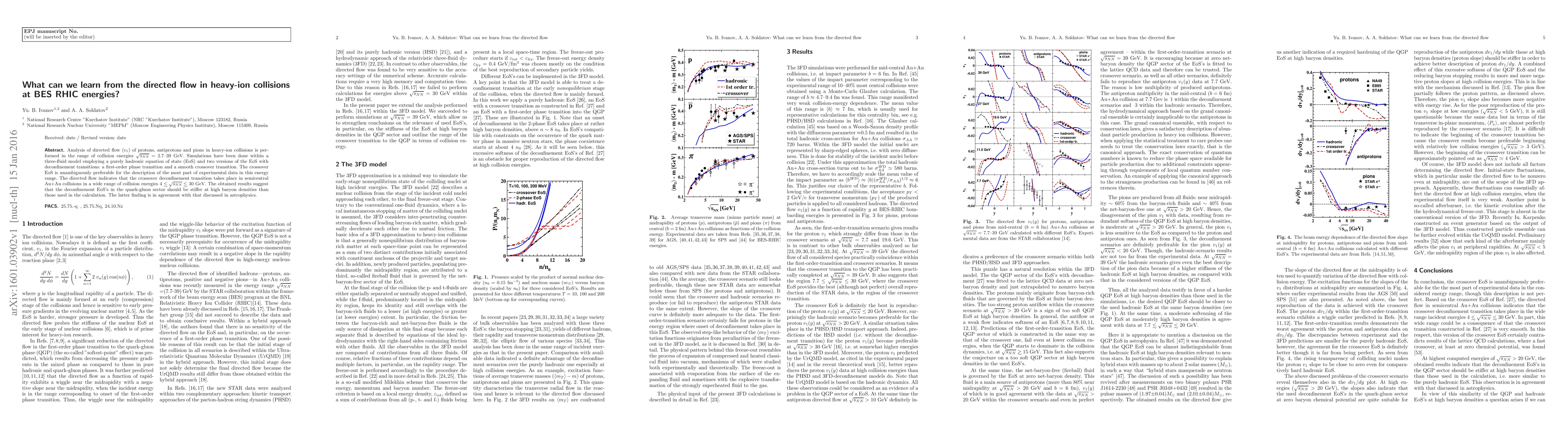 Analysis of directed flow ($v_1$) of protons, antiprotons and pions in heavy-ion collisions is performed in the range of collision energies $\sqrt{s_{NN}}$ = 2.7--39 GeV. Simulations have been done within a three-fluid model employing a purely hadronic equation of state (EoS) and two versions of the EoS with deconfinement transitions: a first-order phase transition and a smooth crossover transition. The crossover EoS is unambiguously preferable for the description of the most part of experimental data in this energy range. The directed flow indicates that the crossover deconfinement transition takes place in semicentral Au+Au collisions in a wide range of collision energies 4 \lsim\sqrt{s_{NN}}\lsim$ 30 GeV. The obtained results suggest that the deconfinement EoS's in the quark-gluon sector should be stiffer at high baryon densities than those used in the calculation. The latter finding is in agreement with that discussed in astrophysics.