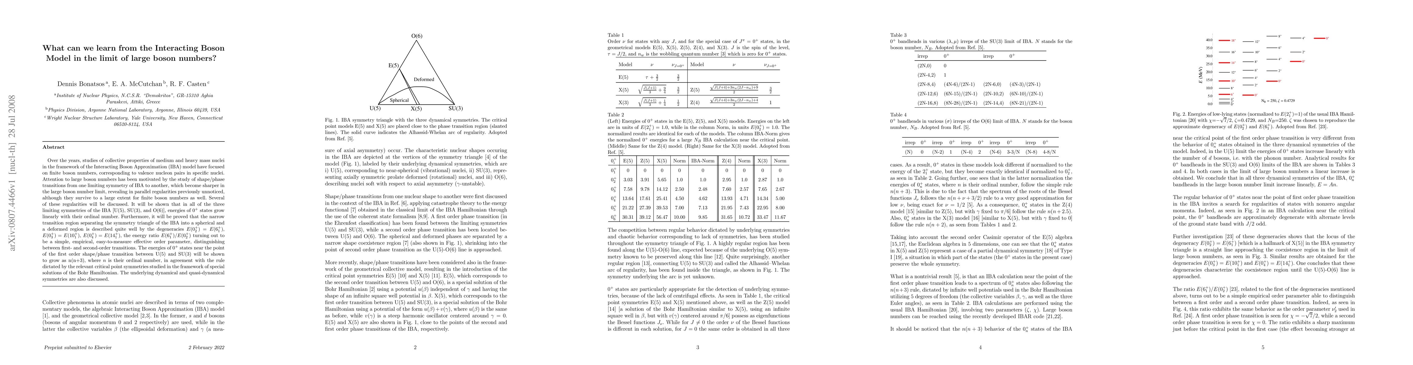 Over the years, studies of collective properties of medium and heavy mass nuclei in the framework of the Interacting Boson Approximation (IBA) model have focused on finite boson numbers, corresponding to valence nucleon pairs in specific nuclei. Attention to large boson numbers has been motivated by the study of shape/phase transitions from one limiting symmetry of IBA to another, which become sharper in the large boson number limit, revealing in parallel regularities previously unnoticed, although they survive to a large extent for finite boson numbers as well. Several of these regularities will be discussed. It will be shown that in all of the three limiting symmetries of the IBA [U(5), SU(3), and O(6)], energies of 0+ states grow linearly with their ordinal number. Furthermore, it will be proved that the narrow transition region separating the symmetry triangle of the IBA into a spherical and a deformed region is described quite well by the degeneracies E(0_2^+)=E(6_1^+), E(0_3^+) =E(10_1^+), E(0_4^+)=E(14_1^+), the energy ratio E(6_1^+) /E(0_2^+) turning out to be a simple, empirical, easy-to-measure effective order parameter, distinguishing between first- and second-order transitions. The energies of 0+ states near the point of the first order shape/phase transition between U(5) and SU(3) will be shown to grow as n(n+3), where n is their ordinal number, in agreement with the rule dictated by the relevant critical point symmetries studied in the framework of special solutions of the Bohr Hamiltonian. The underlying dynamical and quasi-dynamical symmetries are also discussed.