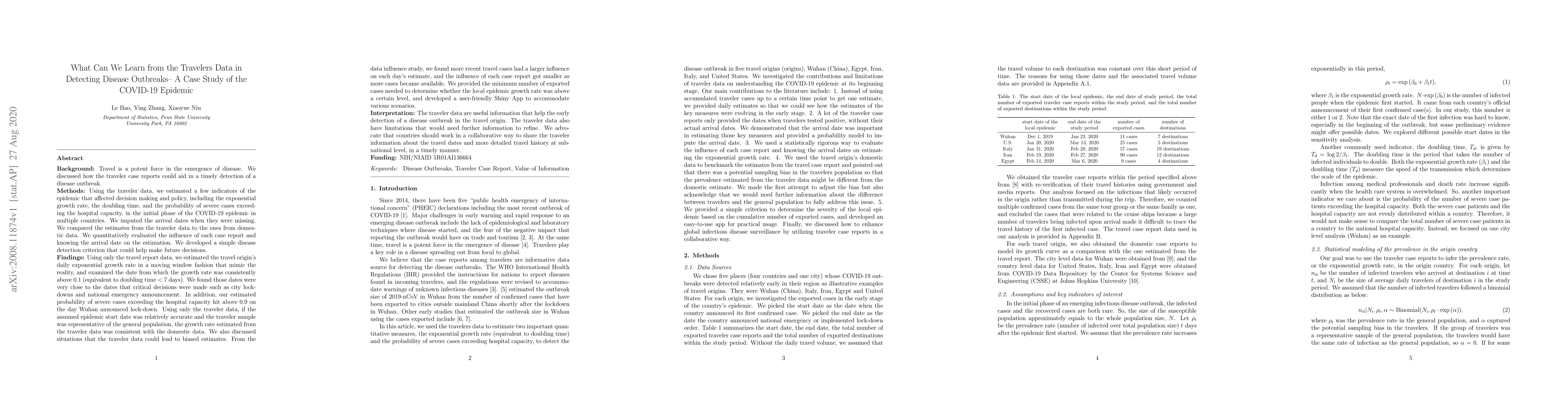 Background: Travel is a potent force in the emergence of disease. We discussed how the traveler case reports could aid in a timely detection of a disease outbreak. Methods: Using the traveler data, we estimated a few indicators of the epidemic that affected decision making and policy, including the exponential growth rate, the doubling time, and the probability of severe cases exceeding the hospital capacity, in the initial phase of the COVID-19 epidemic in multiple countries. We imputed the arrival dates when they were missing. We compared the estimates from the traveler data to the ones from domestic data. We quantitatively evaluated the influence of each case report and knowing the arrival date on the estimation. Findings: We estimated the travel origin's daily exponential growth rate and examined the date from which the growth rate was consistently above 0.1 (equivalent to doubling time < 7 days). We found those dates were very close to the dates that critical decisions were made such as city lock-downs and national emergency announcement. Using only the traveler data, if the assumed epidemic start date was relatively accurate and the traveler sample was representative of the general population, the growth rate estimated from the traveler data was consistent with the domestic data. We also discussed situations that the traveler data could lead to biased estimates. From the data influence study, we found more recent travel cases had a larger influence on each day's estimate, and the influence of each case report got smaller as more cases became available. We provided the minimum number of exported cases needed to determine whether the local epidemic growth rate was above a certain level, and developed a user-friendly Shiny App to accommodate various scenarios.