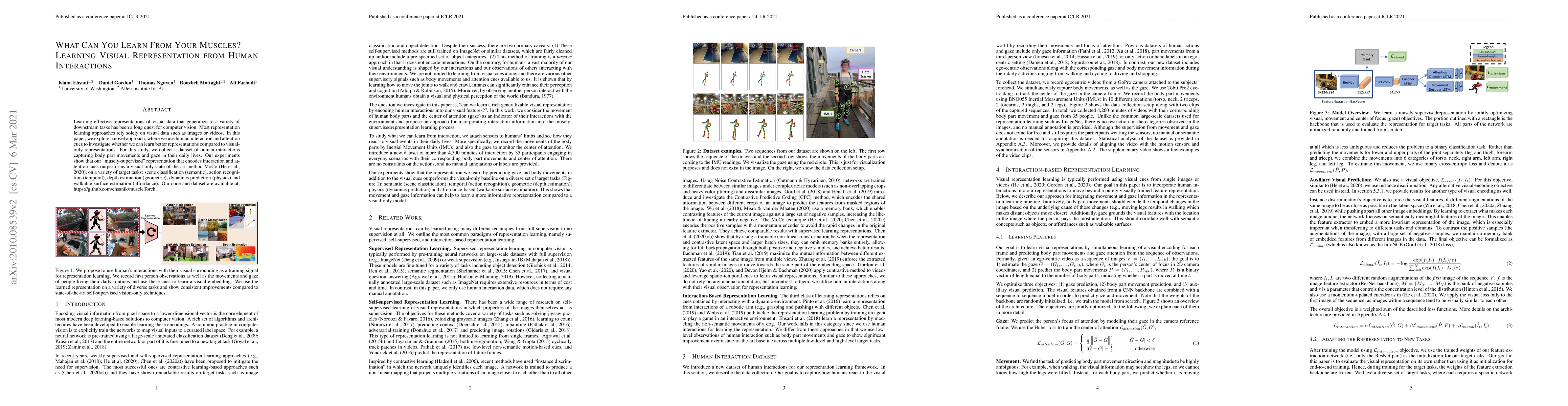 Learning effective representations of visual data that generalize to a variety of downstream tasks has been a long quest for computer vision. Most representation learning approaches rely solely on visual data such as images or videos. In this paper, we explore a novel approach, where we use human interaction and attention cues to investigate whether we can learn better representations compared to visual-only representations. For this study, we collect a dataset of human interactions capturing body part movements and gaze in their daily lives. Our experiments show that our "muscly-supervised" representation that encodes interaction and attention cues outperforms a visual-only state-of-the-art method MoCo (He et al.,2020), on a variety of target tasks: scene classification (semantic), action recognition (temporal), depth estimation (geometric), dynamics prediction (physics) and walkable surface estimation (affordance). Our code and dataset are available at: https://github.com/ehsanik/muscleTorch.