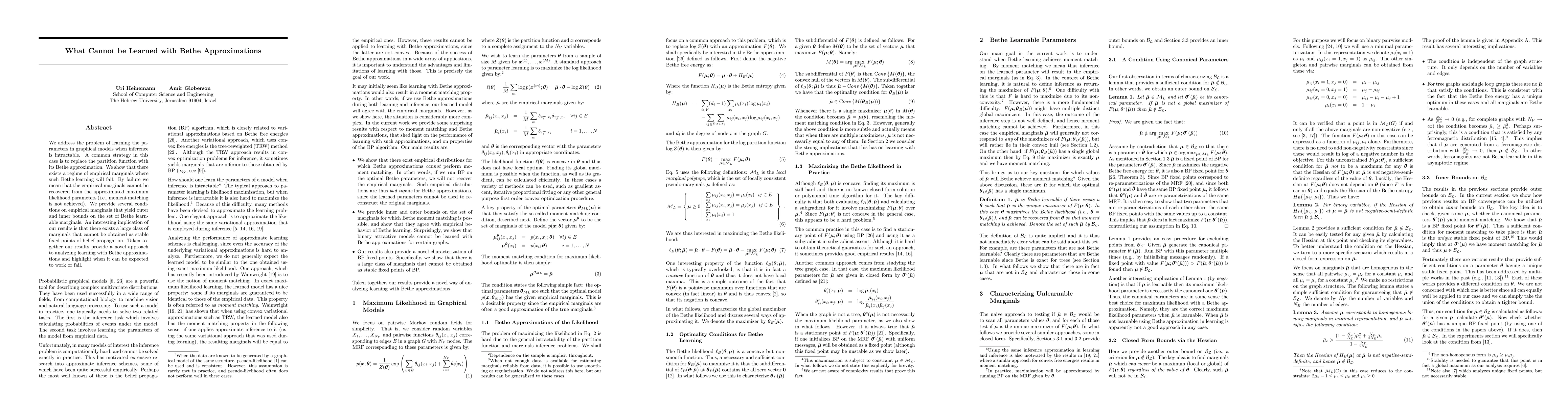 This paper investigates the limitations of learning parameters in graphical models using Bethe approximations when exact inference is infeasible. It demonstrates that Bethe learning fails to recover empirical marginals under certain conditions, revealing a significant class of marginals that cannot be obtained through belief propagation.