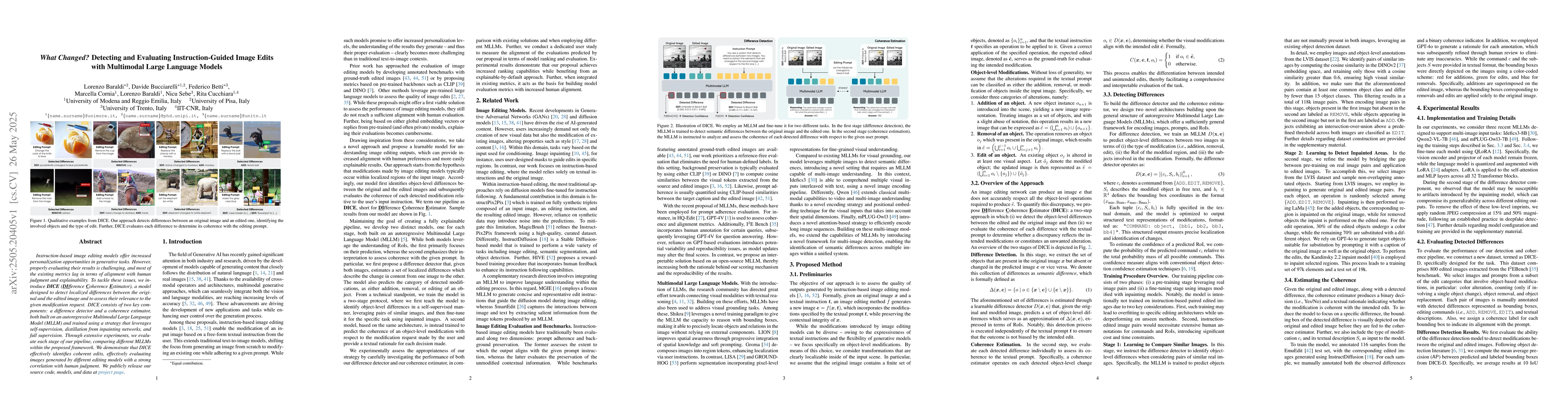 Instruction-based image editing models offer increased personalization opportunities in generative tasks. However, properly evaluating their results is challenging, and most of the existing metrics lag in terms of alignment with human judgment and explainability. To tackle these issues, we introduce DICE (DIfference Coherence Estimator), a model designed to detect localized differences between the original and the edited image and to assess their relevance to the given modification request. DICE consists of two key components: a difference detector and a coherence estimator, both built on an autoregressive Multimodal Large Language Model (MLLM) and trained using a strategy that leverages self-supervision, distillation from inpainting networks, and full supervision. Through extensive experiments, we evaluate each stage of our pipeline, comparing different MLLMs within the proposed framework. We demonstrate that DICE effectively identifies coherent edits, effectively evaluating images generated by different editing models with a strong correlation with human judgment. We publicly release our source code, models, and data.