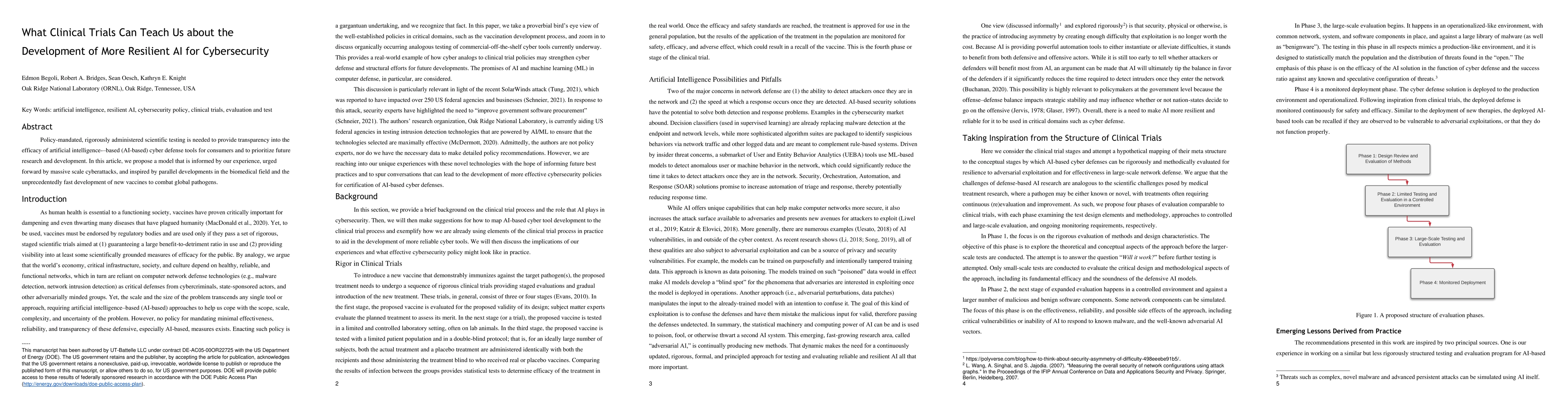 Policy-mandated, rigorously administered scientific testing is needed to provide transparency into the efficacy of artificial intelligence-based (AI-based) cyber defense tools for consumers and to prioritize future research and development. In this article, we propose a model that is informed by our experience, urged forward by massive scale cyberattacks, and inspired by parallel developments in the biomedical field and the unprecedentedly fast development of new vaccines to combat global pathogens.