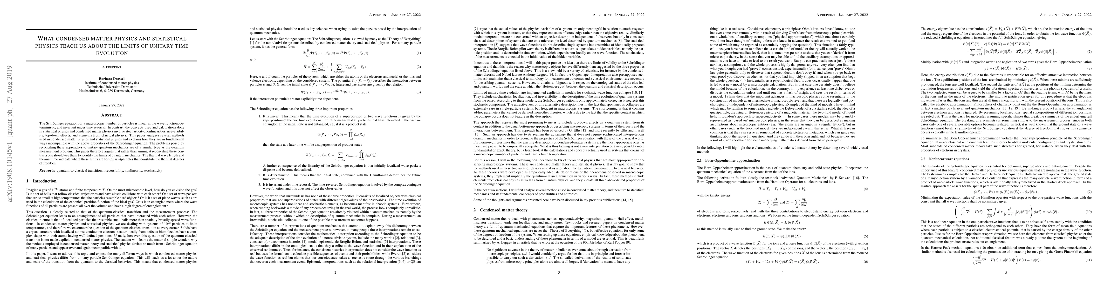 The Schrodinger equation for a macroscopic number of particles is linear in the wave function, deterministic, and invariant under time reversal. In contrast, the concepts used and calculations done in statistical physics and condensed matter physics involve stochasticity, nonlinearities, irreversibility, top-down effects, and elements from classical physics. This paper analyzes several methods used in condensed matter physics and statistical physics and explains how they are in fundamental ways incompatible with the above properties of the Schrodinger equation. The problems posed by reconciling these approaches to unitary quantum mechanics are of a similar type as the quantum measurement problem. This paper therefore argues that rather than aiming at reconciling these contrasts one should use them to identify the limits of quantum mechanics. The thermal wave length and thermal time indicate where these limits are for (quasi-)particles that constitute the thermal degrees of freedom.