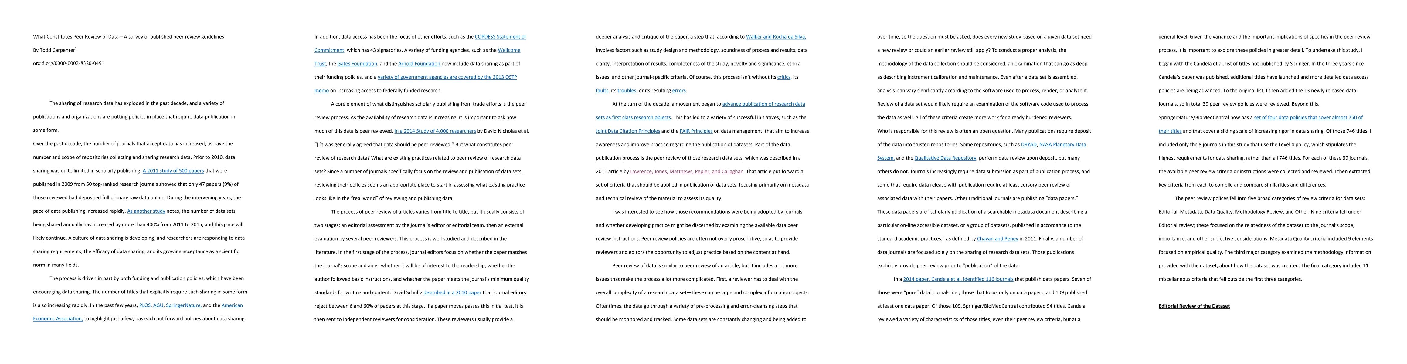 This study surveys the publicly available peer review guidelines of 39 scientific journals that publish data papers to identify the most and least frequently referenced criteria. It also compares current practices with proposed criteria from 2012.