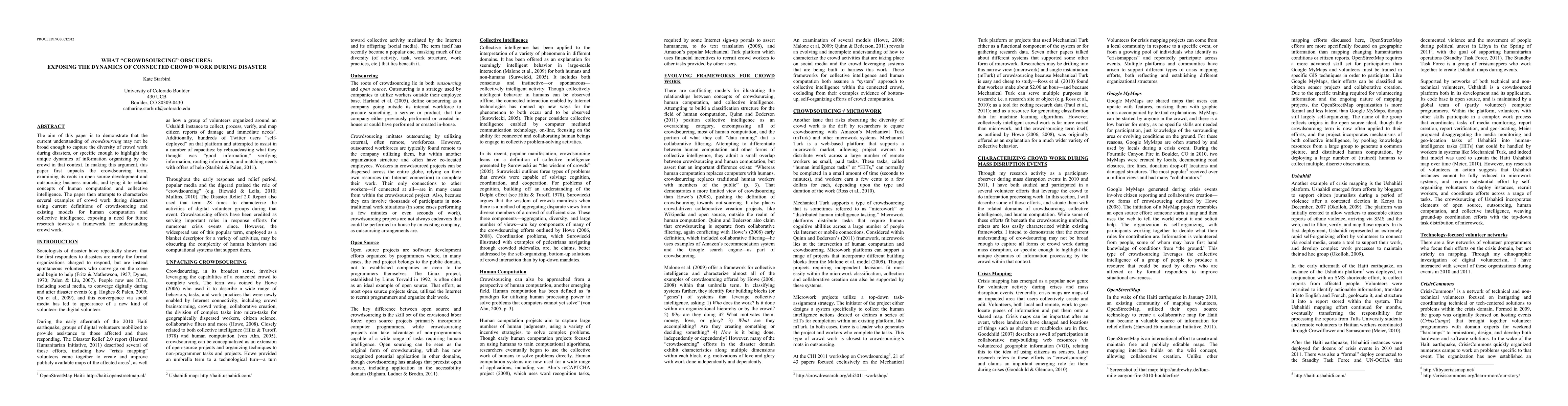 The aim of this paper is to demonstrate that the current understanding of crowdsourcing may not be broad enough to capture the diversity of crowd work during disasters, or specific enough to highlight the unique dynamics of information organizing by the crowd in that context. In making this argument, this paper first unpacks the crowdsourcing term, examining its roots in open source development and outsourcing business models, and tying it to related concepts of human computation and collective intelligence. The paper then attempts to characterize several examples of crowd work during disasters using current definitions of crowdsourcing and existing models for human computation and collective intelligence, exposing a need for future research towards a framework for understanding crowd work.