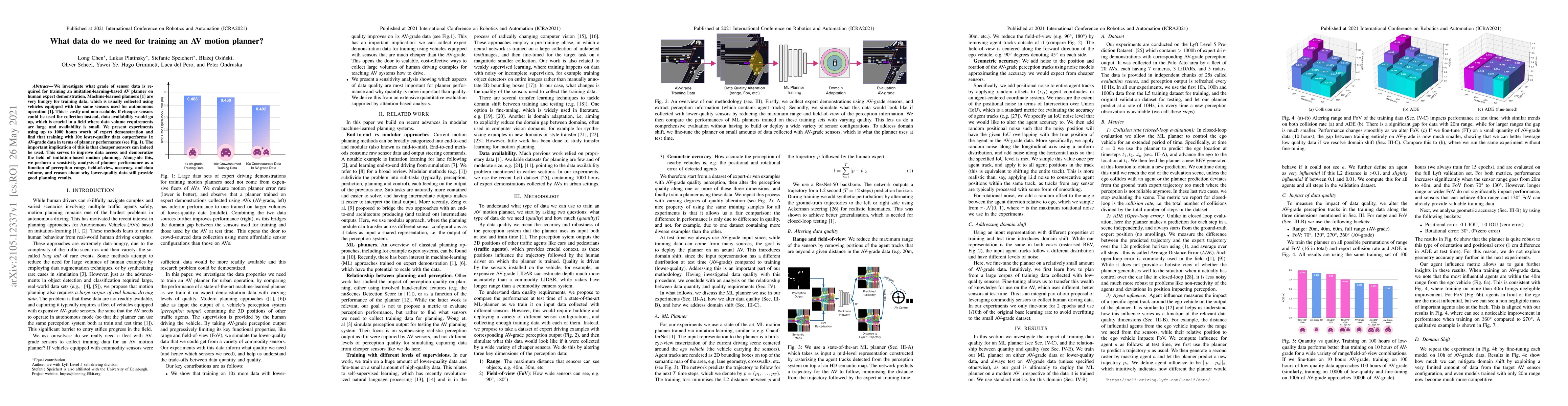 We investigate what grade of sensor data is required for training an imitation-learning-based AV planner on human expert demonstration. Machine-learned planners are very hungry for training data, which is usually collected using vehicles equipped with the same sensors used for autonomous operation. This is costly and non-scalable. If cheaper sensors could be used for collection instead, data availability would go up, which is crucial in a field where data volume requirements are large and availability is small. We present experiments using up to 1000 hours worth of expert demonstration and find that training with 10x lower-quality data outperforms 1x AV-grade data in terms of planner performance. The important implication of this is that cheaper sensors can indeed be used. This serves to improve data access and democratize the field of imitation-based motion planning. Alongside this, we perform a sensitivity analysis of planner performance as a function of perception range, field-of-view, accuracy, and data volume, and the reason why lower-quality data still provide good planning results.