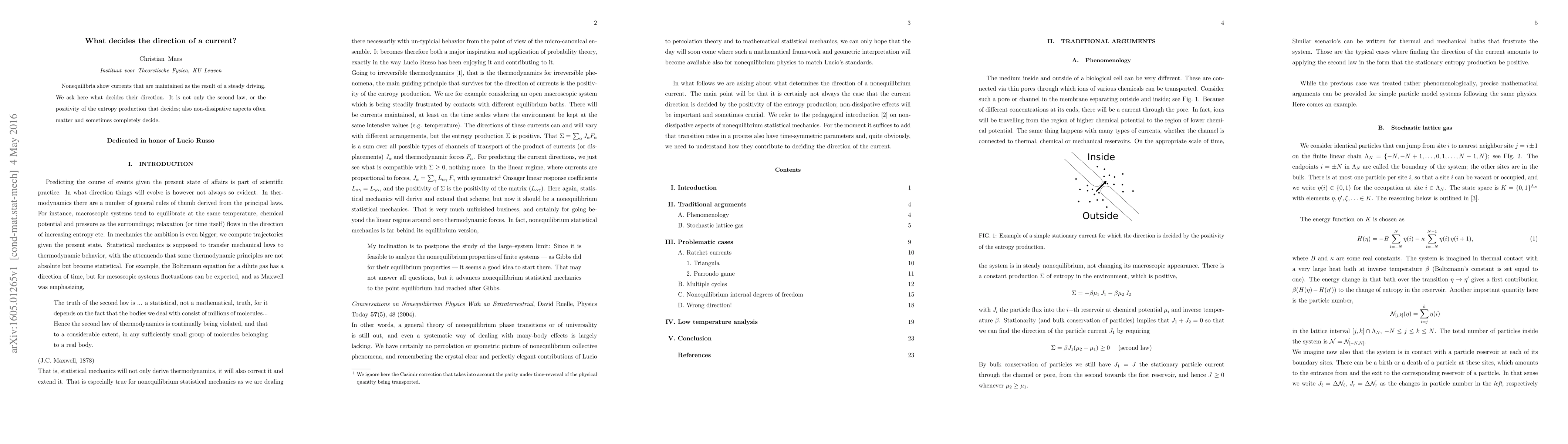 This paper explores the factors determining the direction of currents in nonequilibrium systems, highlighting that entropy production alone isn't decisive; non-dissipative aspects can also play a crucial role in establishing current direction.