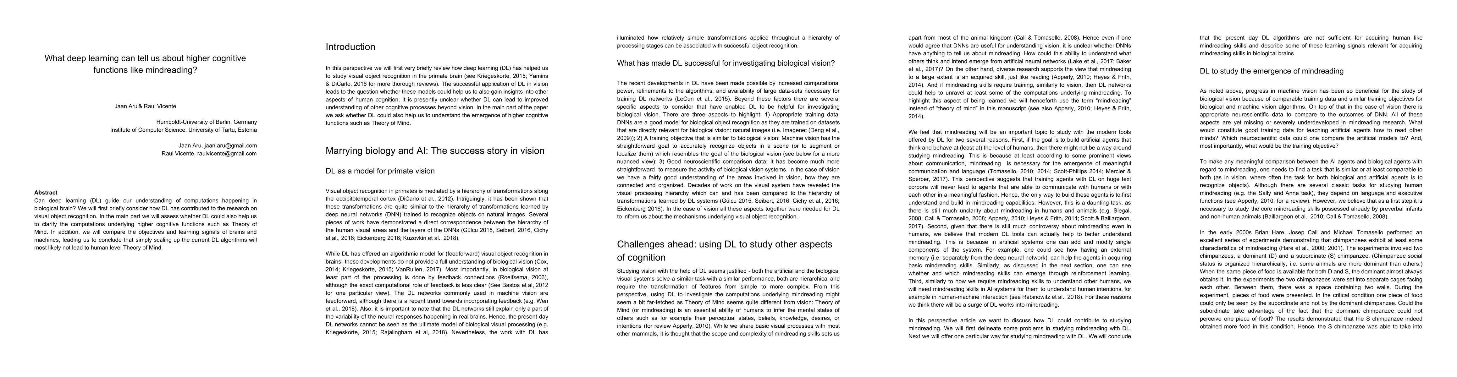 Can deep learning (DL) guide our understanding of computations happening in biological brain? We will first briefly consider how DL has contributed to the research on visual object recognition. In the main part we will assess whether DL could also help us to clarify the computations underlying higher cognitive functions such as Theory of Mind. In addition, we will compare the objectives and learning signals of brains and machines, leading us to conclude that simply scaling up the current DL algorithms will most likely not lead to human level Theory of Mind.