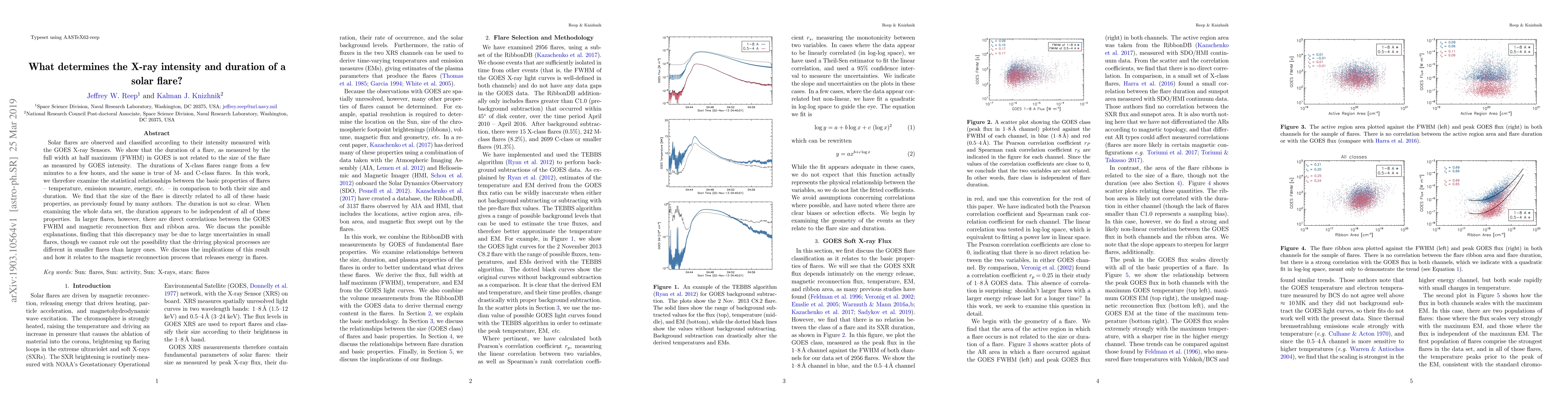 Solar flares are observed and classified according to their intensity measured with the GOES X-ray Sensors. We show that the duration of a flare, as measured by the full width at half maximum (FWHM) in GOES is not related to the size of the flare as measured by GOES intensity. The durations of X-class flares range from a few minutes to a few hours, and the same is true of M- and C-class flares. In this work, we therefore examine the statistical relationships between the basic properties of flares -- temperature, emission measure, energy, etc. -- in comparison to both their size and duration. We find that the size of the flare is directly related to all of these basic properties, as previously found by many authors. The duration is not so clear. When examining the whole data set, the duration appears to be independent of all of these properties. In larger flares, however, there are direct correlations between the GOES FWHM and magnetic reconnection flux and ribbon area. We discuss the possible explanations, finding that this discrepancy may be due to large uncertainties in small flares, though we cannot rule out the possibility that the driving physical processes are different in smaller flares than larger ones. We discuss the implications of this result and how it relates to the magnetic reconnection process that releases energy in flares.
