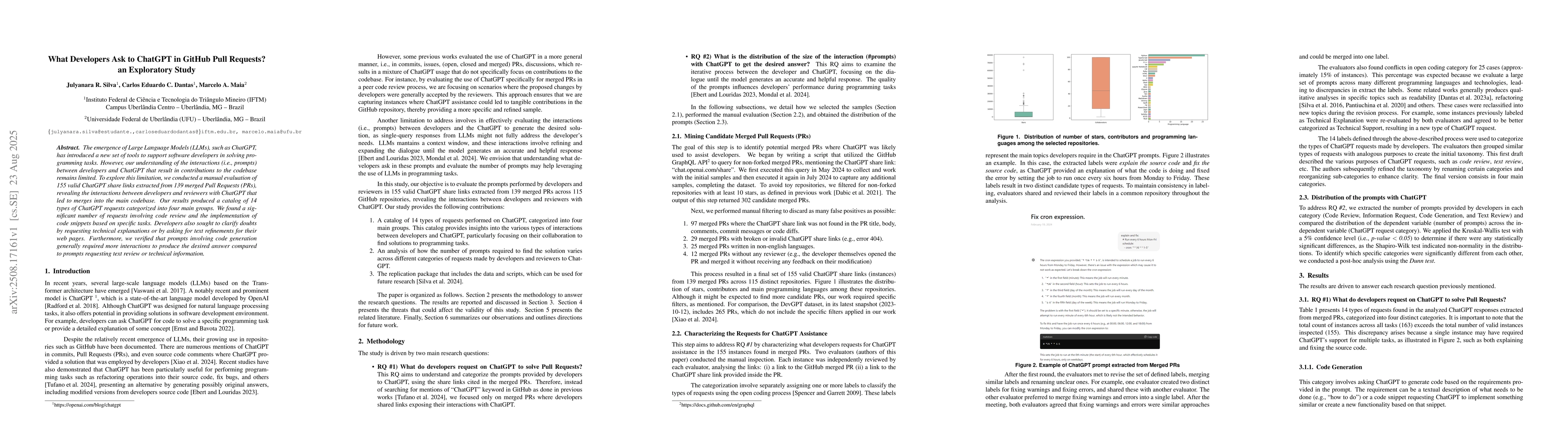 The emergence of Large Language Models (LLMs), such as ChatGPT, has introduced a new set of tools to support software developers in solving pro- gramming tasks. However, our understanding of the interactions (i.e., prompts) between developers and ChatGPT that result in contributions to the codebase remains limited. To explore this limitation, we conducted a manual evaluation of 155 valid ChatGPT share links extracted from 139 merged Pull Requests (PRs), revealing the interactions between developers and reviewers with ChatGPT that led to merges into the main codebase. Our results produced a catalog of 14 types of ChatGPT requests categorized into four main groups. We found a significant number of requests involving code review and the implementation of code snippets based on specific tasks. Developers also sought to clarify doubts by requesting technical explanations or by asking for text refinements for their web pages. Furthermore, we verified that prompts involving code generation generally required more interactions to produce the desired answer compared to prompts requesting text review or technical information.