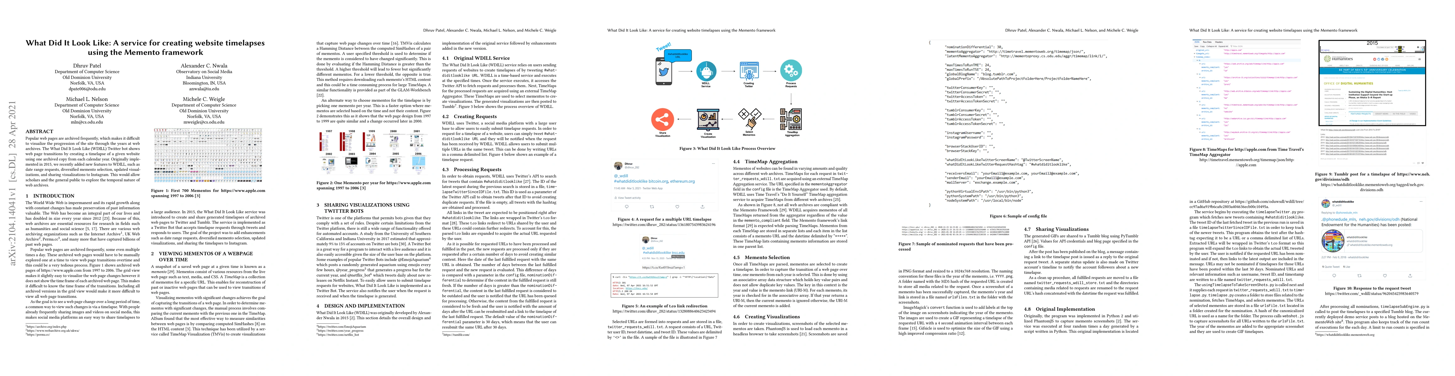 The What Did It Look Like Twitter bot creates timelapses of website changes using archived web pages, allowing scholars to visualize the progression of websites over time. New features were added to enhance the service, including date range requests and sharing capabilities.