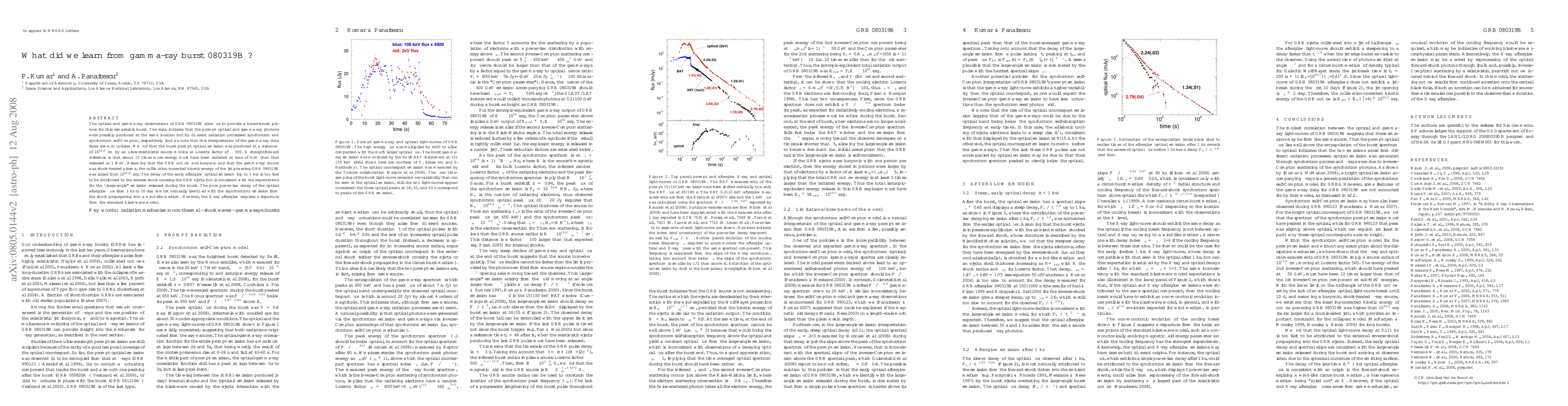The optical and gamma-ray observations of GRB 080319B allow us to determine a fairly complete physical picture for this remarkable burst. The data indicate that the prompt optical and gamma-ray photons were produced at the same location but by different radiation processes: synchrotron and synchrotron self-Compton, respectively. The burst emission was produced at a distance of 10^{16.5} cm from the center of explosion by an ultra-relativistic source moving at Lorentz factor of ~500. A straightforward inference is that about 10 times more energy must have been radiated at tens of GeV than that released at ~1 MeV. Assuming that the GRB outflow was baryonic and that the gamma-ray source was shock-heated plasma, the collimation-corrected kinetic energy of the jet powering GRB 080319B was larger than 10^{52.3} erg. The decay of the early afterglow optical emission (up to 1 ks) is too fast to be attributed to the reverse shock crossing the GRB ejecta but is consistent with the expectations for the "large-angle emission" released during the burst. The pure power-law decay of the optical afterglow flux from 1 ks to 10 day is most naturally identified with the (synchrotron) emission from the shock propagating into a wind-like medium. However, the X-ray afterglow requires a departure from the standard blast-wave model.