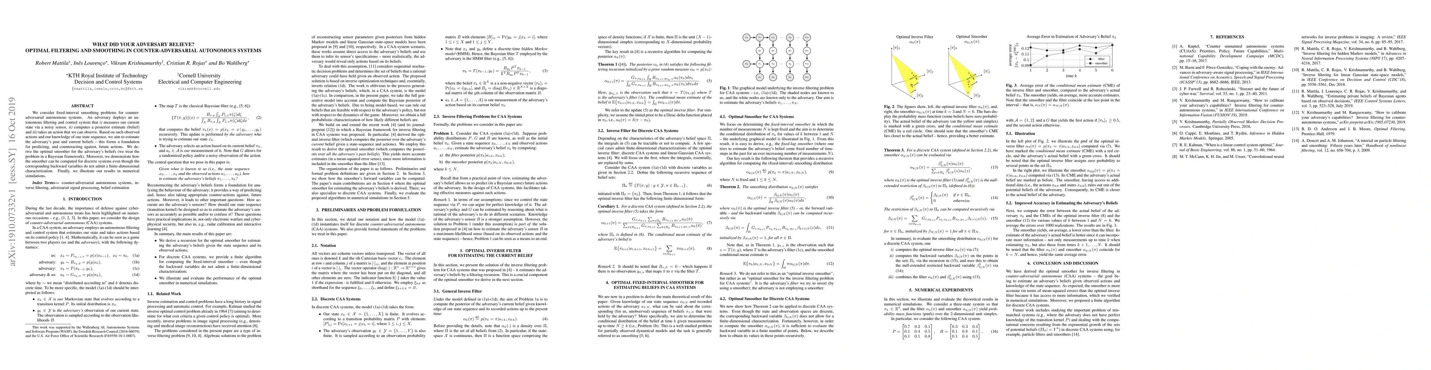 We consider fixed-interval smoothing problems for counter-adversarial autonomous systems. An adversary deploys an autonomous filtering and control system that i) measures our current state via a noisy sensor, ii) computes a posterior estimate (belief) and iii) takes an action that we can observe. Based on such observed actions and our knowledge of our state sequence, we aim to estimate the adversary's past and current beliefs -- this forms a foundation for predicting, and counteracting against, future actions. We derive the optimal smoother for the adversary's beliefs (we treat the problem in a Bayesian framework). Moreover, we demonstrate how the smoother can be computed for discrete systems even though the corresponding backward variables do not admit a finite-dimensional characterization. Finally, we illustrate our results in numerical simulations.
