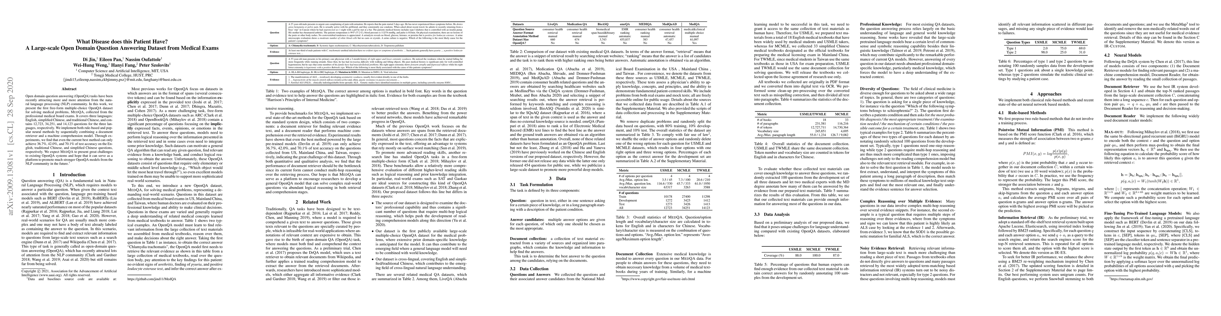 Open domain question answering (OpenQA) tasks have been recently attracting more and more attention from the natural language processing (NLP) community. In this work, we present the first free-form multiple-choice OpenQA dataset for solving medical problems, MedQA, collected from the professional medical board exams. It covers three languages: English, simplified Chinese, and traditional Chinese, and contains 12,723, 34,251, and 14,123 questions for the three languages, respectively. We implement both rule-based and popular neural methods by sequentially combining a document retriever and a machine comprehension model. Through experiments, we find that even the current best method can only achieve 36.7\%, 42.0\%, and 70.1\% of test accuracy on the English, traditional Chinese, and simplified Chinese questions, respectively. We expect MedQA to present great challenges to existing OpenQA systems and hope that it can serve as a platform to promote much stronger OpenQA models from the NLP community in the future.