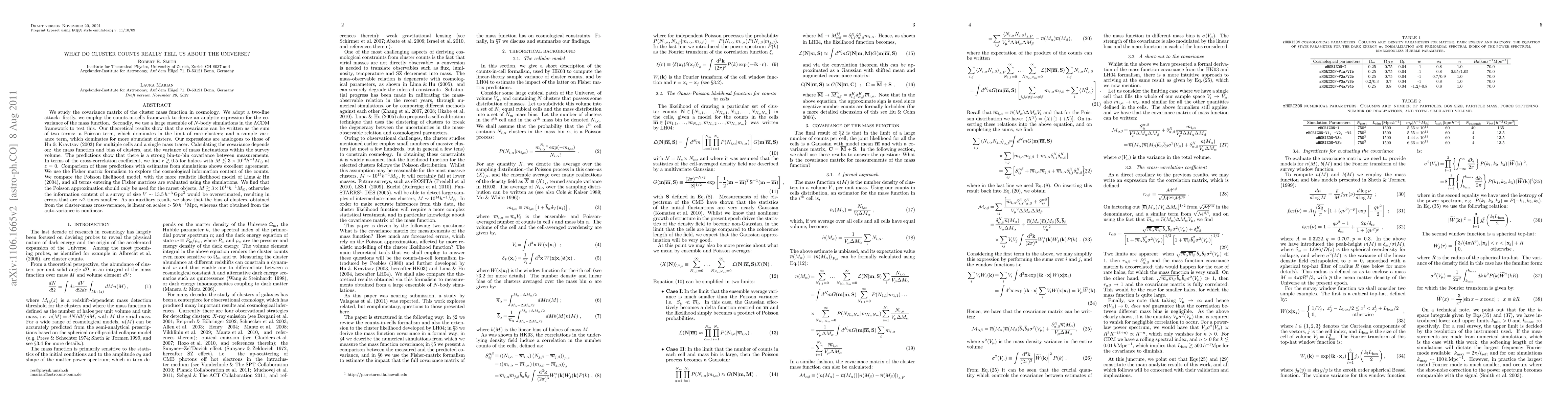 We study the covariance matrix of the cluster mass function in cosmology. We adopt a two-line attack: firstly, we employ the counts-in-cells framework to derive an analytic expression for the covariance of the mass function. Secondly, we use a large ensemble of N-body simulations in the LCDM framework to test this. Our theoretical results show that the covariance can be written as the sum of two terms: a Poisson term, which dominates in the limit of rare clusters; and a sample variance term, which dominates for more abundant clusters. Our expressions are analogous to those of Hu & Kravtsov (2003) for multiple cells and a single mass tracer. Calculating the covariance depends on: the mass function and bias of clusters, and the variance of mass fluctuations within the survey volume. The predictions show that there is a strong bin-to-bin covariance between measurements. In terms of the cross-correlation coefficient, we find r~0.5 for haloes with M<3e14 Msol at z=0. Comparison of these predictions with estimates from simulations shows excellent agreement. We use the Fisher matrix formalism to explore the cosmological information content of the counts. We compare the Poisson likelihood model, with the more realistic likelihood model of Lima & Hu (2004), and all terms entering the Fisher matrices are evaluated using the simulations. We find that the Poisson approximation should only be used for the rarest objects, M>3e14 Msol, otherwise the information content of a survey of size V~13.5 [Gpc/h]^3 would be overestimated, resulting in errors that are ~2 times smaller. As an auxiliary result, we show that the bias of clusters, obtained from the cluster-mass cross-variance, is linear on scales >50 Mpc/h, whereas that obtained from the auto-variance is nonlinear.