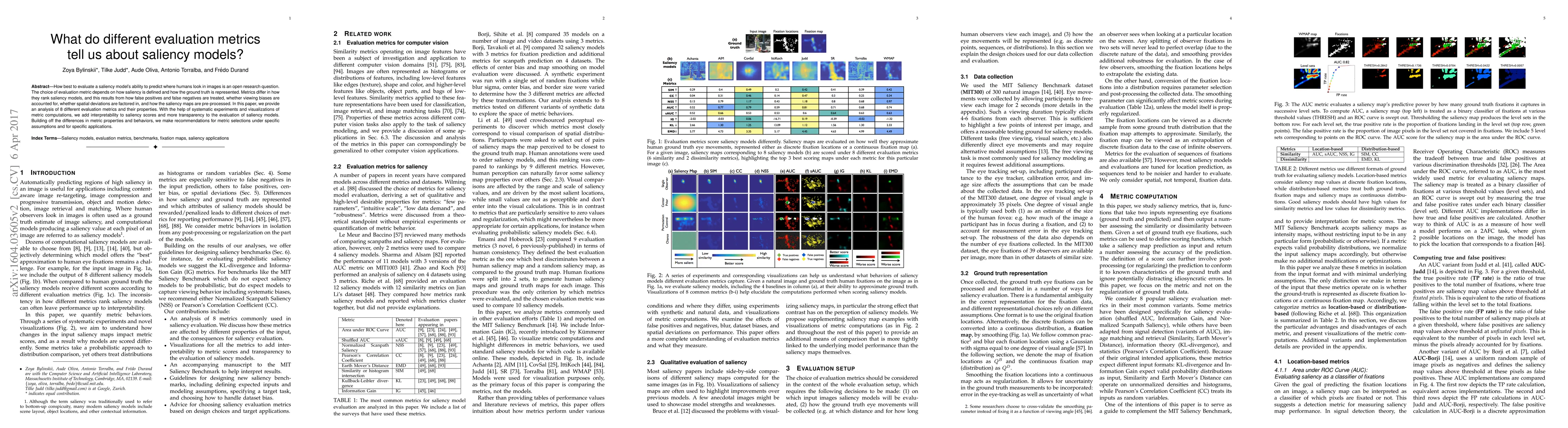This paper analyzes eight evaluation metrics for saliency models, highlighting their properties and differences in ranking models based on factors like false positives, viewing biases, and spatial deviations. It provides recommendations for selecting appropriate metrics based on specific research assumptions and applications.