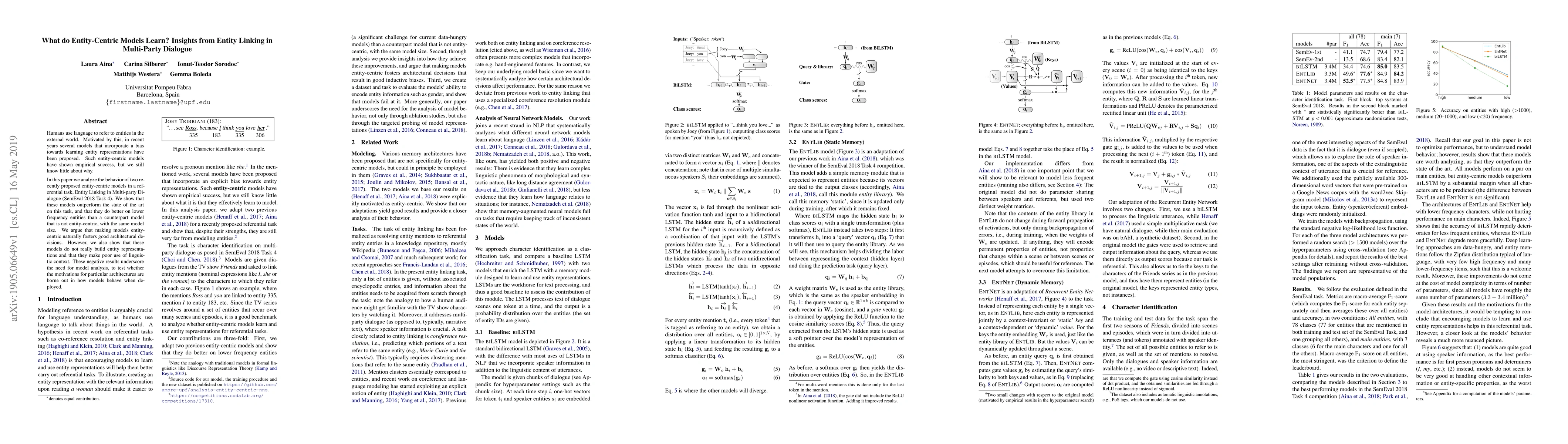 Humans use language to refer to entities in the external world. Motivated by this, in recent years several models that incorporate a bias towards learning entity representations have been proposed. Such entity-centric models have shown empirical success, but we still know little about why. In this paper we analyze the behavior of two recently proposed entity-centric models in a referential task, Entity Linking in Multi-party Dialogue (SemEval 2018 Task 4). We show that these models outperform the state of the art on this task, and that they do better on lower frequency entities than a counterpart model that is not entity-centric, with the same model size. We argue that making models entity-centric naturally fosters good architectural decisions. However, we also show that these models do not really build entity representations and that they make poor use of linguistic context. These negative results underscore the need for model analysis, to test whether the motivations for particular architectures are borne out in how models behave when deployed.