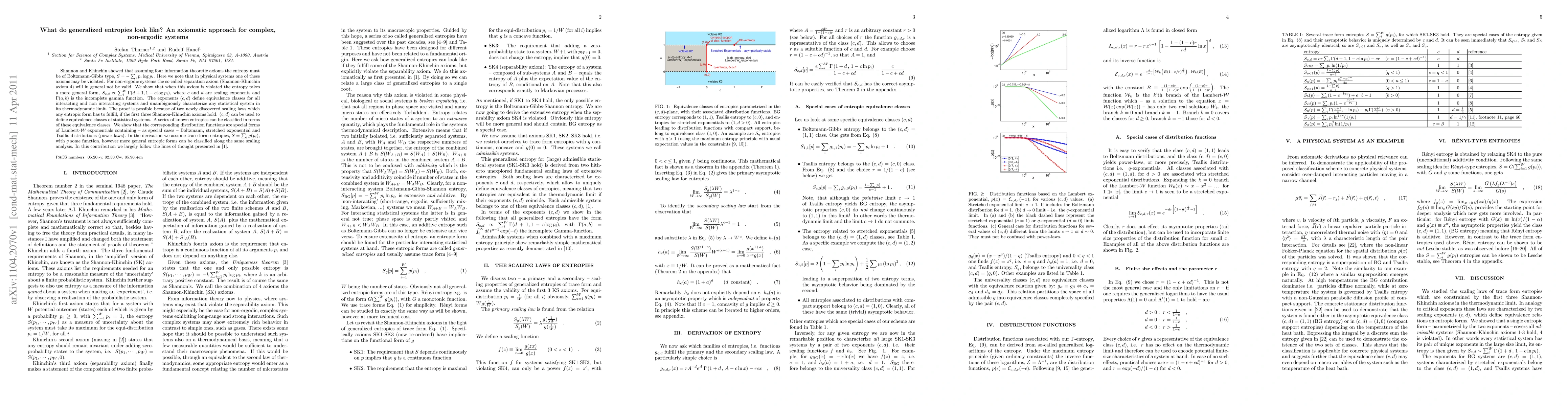 Shannon and Khinchin showed that assuming four information theoretic axioms the entropy must be of Boltzmann-Gibbs type, $S=-\sum_i p_i \log p_i$. Here we note that in physical systems one of these axioms may be violated. For non-ergodic systems the so called separation axiom (Shannon-Khinchin axiom 4) will in general not be valid. We show that when this axiom is violated the entropy takes a more general form, $S_{c,d}\propto \sum_i ^W \Gamma(d+1, 1- c \log p_i)$, where $c$ and $d$ are scaling exponents and $\Gamma(a,b)$ is the incomplete gamma function. The exponents $(c,d)$ define equivalence classes for all interacting and non interacting systems and unambiguously characterize any statistical system in its thermodynamic limit. The proof is possible because of two newly discovered scaling laws which any entropic form has to fulfill, if the first three Shannon-Khinchin axioms hold. $(c,d)$ can be used to define equivalence classes of statistical systems. A series of known entropies can be classified in terms of these equivalence classes. We show that the corresponding distribution functions are special forms of Lambert-${\cal W}$ exponentials containing -- as special cases -- Boltzmann, stretched exponential and Tsallis distributions (power-laws). In the derivation we assume trace form entropies, $S=\sum_i g(p_i)$, with $g$ some function, however more general entropic forms can be classified along the same scaling analysis.
